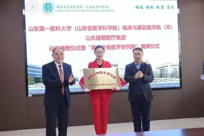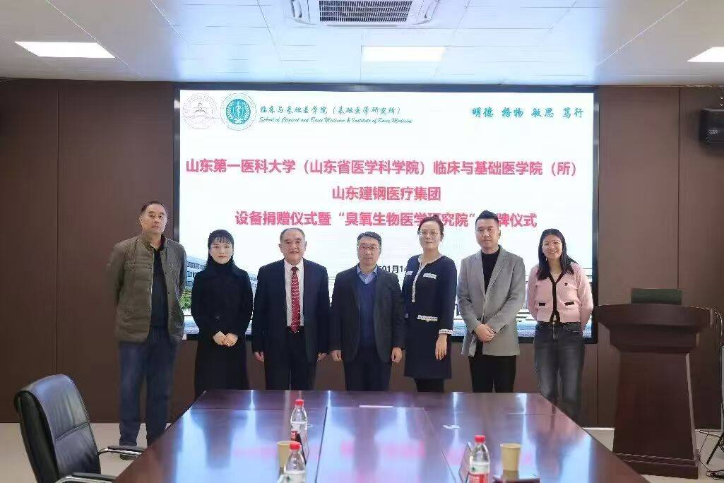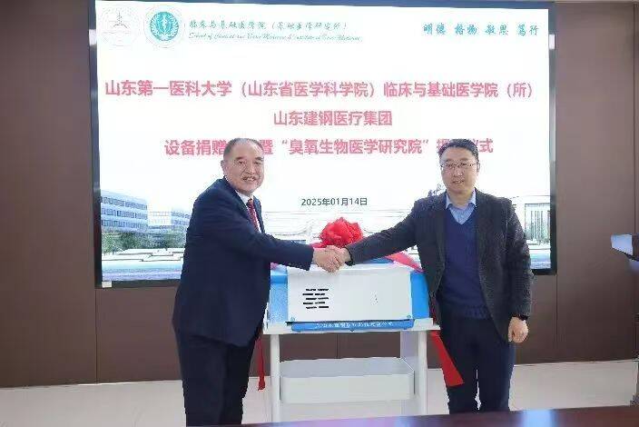 2025 年 1 月 14 日,山东建钢医疗集团设备捐赠仪式暨“臭氧生物医学研究院”揭牌仪式在公司举行。院(所)党委书记张海东、院(所)副经理宋国华、建钢医疗集团经理刘建钢、董事长徐飞及集团职能部门相关人员和院(所)部分教师同学出席此次活动。