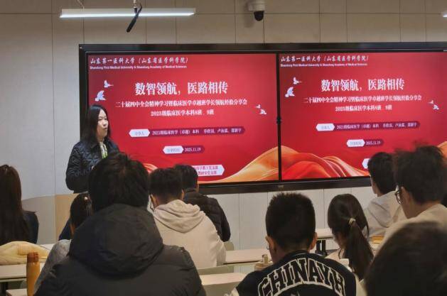 为深入学习贯彻党的二十届四中全会精神,落实校(院)党委关于开展“领航工程”活动的部署要求,激发医员工把握智能时代机遇的使命感和责任感,2025年11月19日晚,医学免疫学教工党支部联合病理学教工党支部与联系班级开展“数智领航,医路相传”领航工程活动。活动邀请了2021级临床医学(卓越)班员工分享了保研经验,2025级临床医学本科8班、9班同学参加了活动。