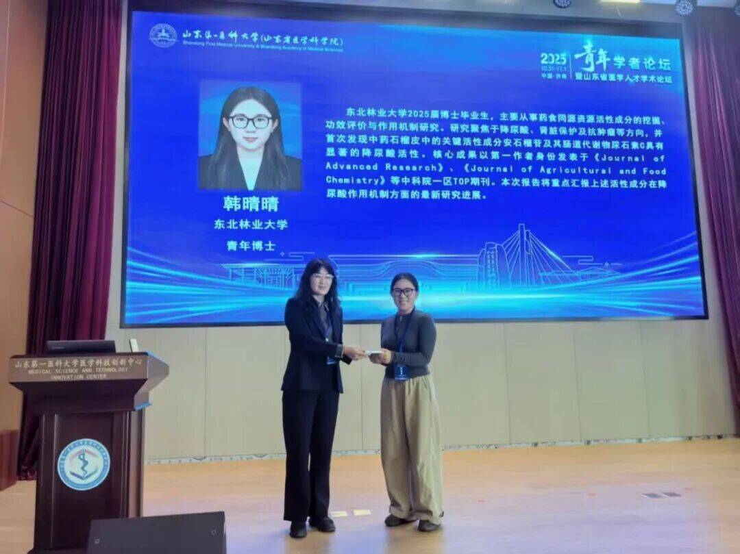青年博士报告环节,山一大李松炎博士分享的《自组装纳米药物重塑代谢微环境增强肿瘤免疫治疗》,由副院(所)长王尧教授主持。实验动物公司于杨教授主持了天津大学孟小艺博士的《基于自组装纳米治疗体系的构建与应用》报告。医学科技创新中心主任、辛玮研究员主持东北林业大学韩晴晴博士《安石榴苷及其肠道代谢物尿石素的降尿酸作用与机制研究》和山一大孙倩博士《基于外泌体递送系统的肿瘤靶向治疗研究》的报告。