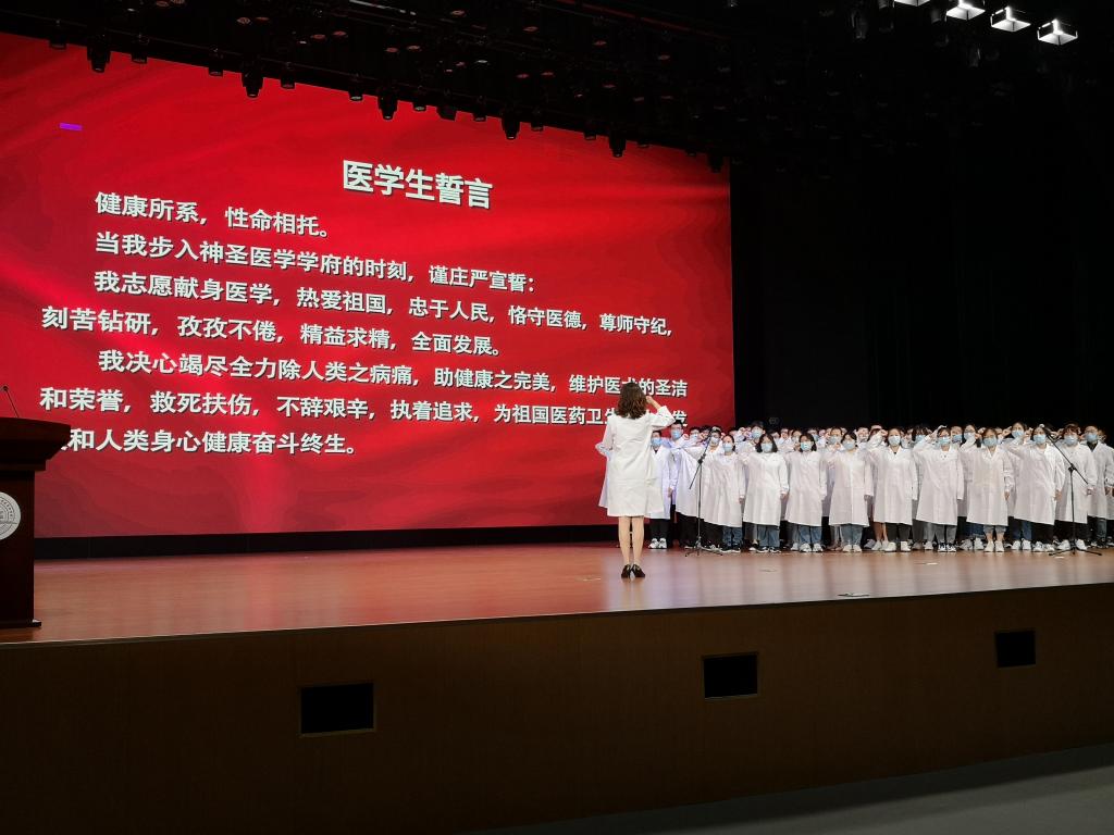 活动最后,2020级临床医学国际班全体同学作为医员工代表上台宣读医员工誓言。他们身着白色隔离衣,在领誓人的带领下,用铿锵的誓言表达他们愿为祖国医药卫生事业的发展和人类身心健康奋斗终生的决心。