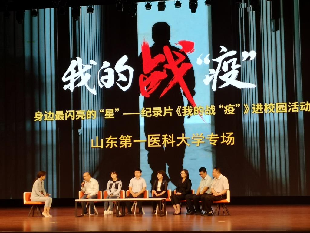 9月25日,基础医公司2020级临床医学国际班全体同学在济南主校区参加了由山东广播电视台主办的“身边最闪亮的“星”——纪录片《我的战“疫”》走进校园”活动。同学们在现场与山东援鄂医疗队队员代表面对面交流。