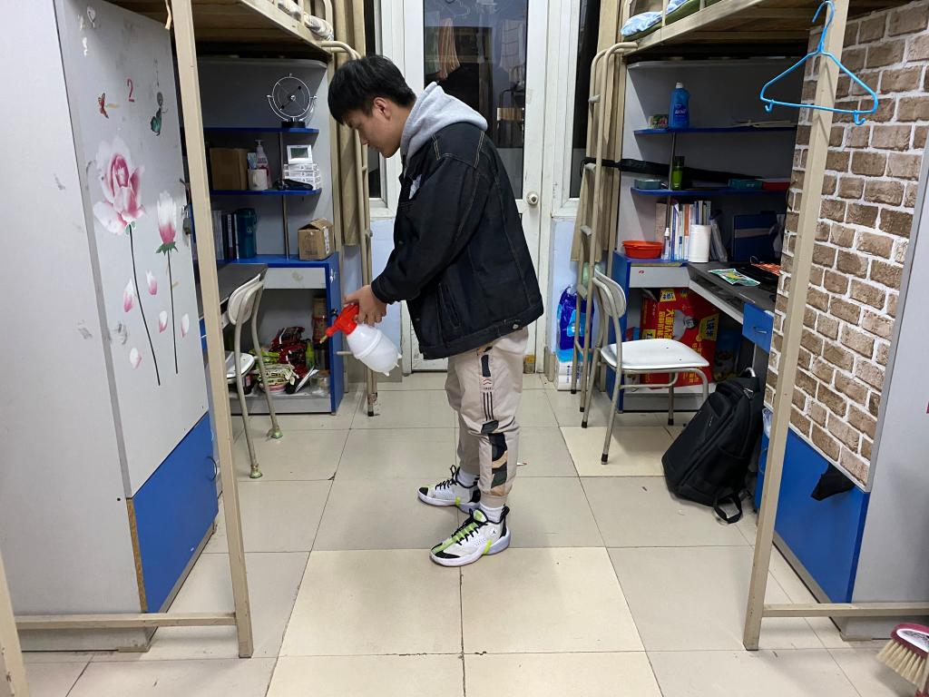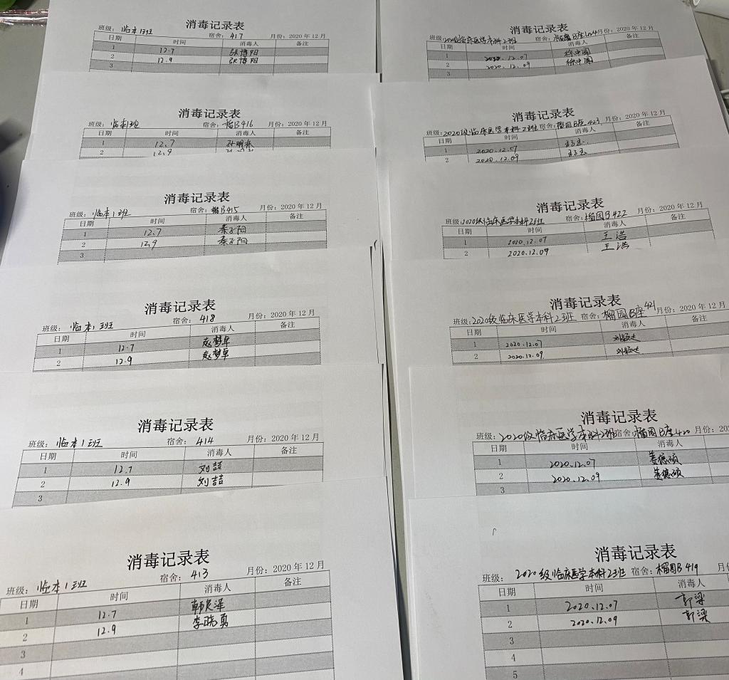 自12月1日起,由各班卫生委员负责,每两天对各宿舍进行全面消杀,员工会自律委员会不定期对宿舍消毒情况进行详细检查并统计上报相关情况。