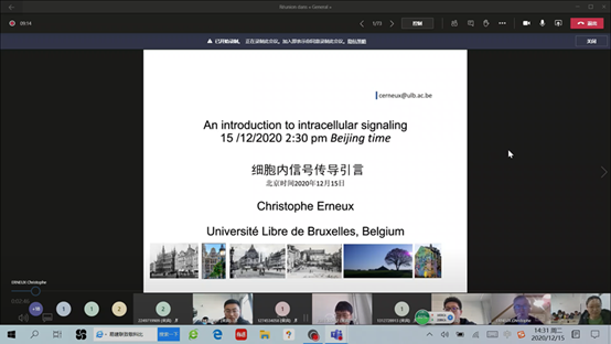 为进一步提升公司临床医学本科(国际班)教学质量,12月15日下午,比利时UniversitéLibre de Bruxelles(ULB)大学ERNEUX Christophe教授应教务部、对外合作交流部、基础医公司(基础医学研究所)邀请,通过teams在线为2019级临床医学本科(国际班)员工进行了《细胞信号转导》专题教学。