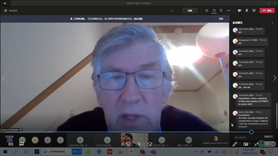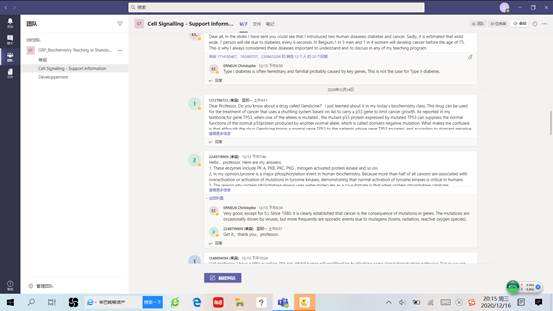 为了保证本次课堂授课质量,ERNEUX Christophe教授提前与任课教师和国际班员工进行了多次交流,确定具体授课内容后提前分享了本次授课PPT及相关文献。授课前和授课过程中同学们兴致很高,积极通过teams与ERNEUX Christophe教授进行了多种不同形式的交流。本次授课ERNEUX Christophe教授结合代表性案例文献介绍了细胞信号转导的基本理论及信号转导异常导致的常见疾病和相关靶向药物。ERNEUX Christophe教授英文发音标准、讲课生动形象、善于启发式教学、注重员工创新能力培养,精心选择的案例文献既有效进行了临床案例教学又帮助员工总结了不同生化章节内容间的联系还使员工学习到了该领域的最新研究进展。授课教师和同学们纷纷感慨本次课使自己开阔了眼界,深刻体会到中西方教学各自特点,明确了如何对两种教学方式进行取长补短从而尽快提升自己。