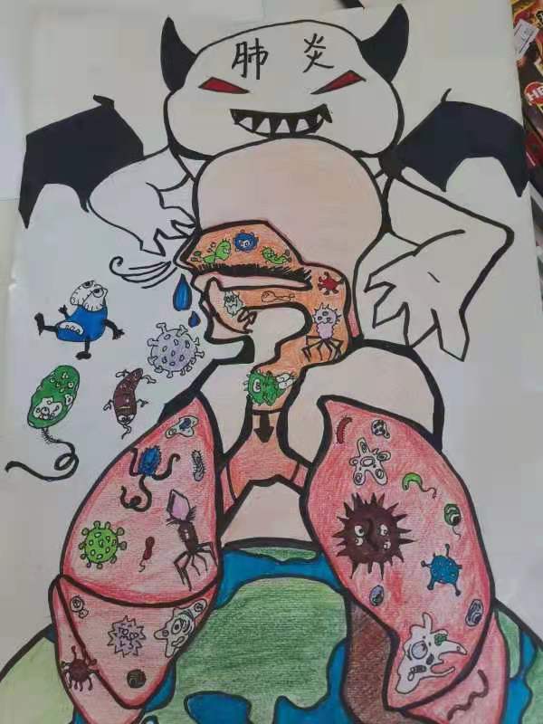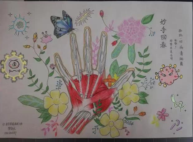 为锻炼同学们的发散性思维,激发创造力,培养社会责任感,自新冠疫情发生以来,院(所)病原生物学教研室在教授医学微生物学和人体寄生虫学课程的同时,积极引导和鼓励2018级临床医学、医学实验技术、口腔医学、2020级眼视光医学等专业的同学绘制“病原创意画”。本届创意画大赛的作品大部分是同学们上半学年在家完成的,因为当时全国还在疫情防控的关键时刻,所以许多同学以这次新冠肺炎为创作灵感完成了作品。