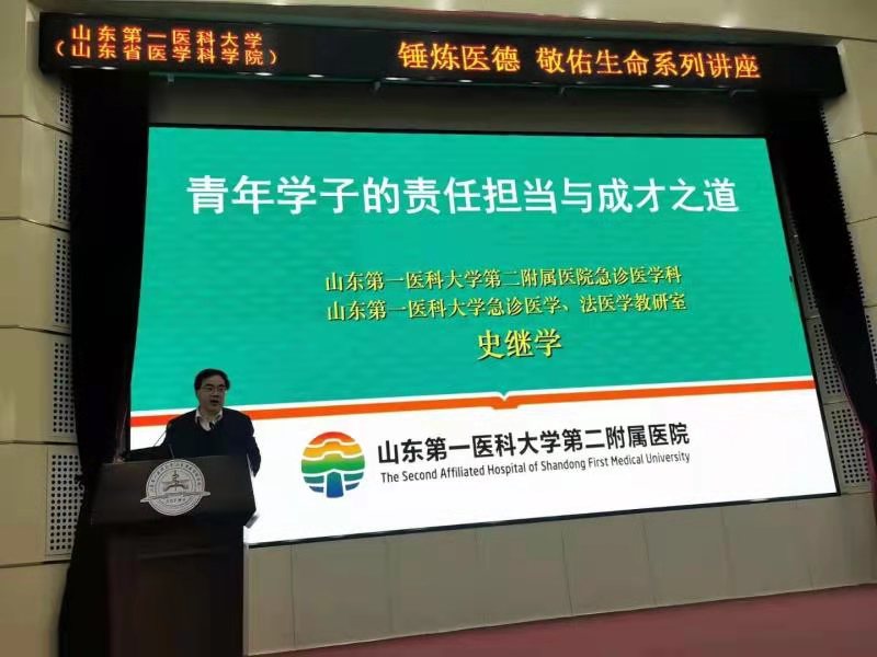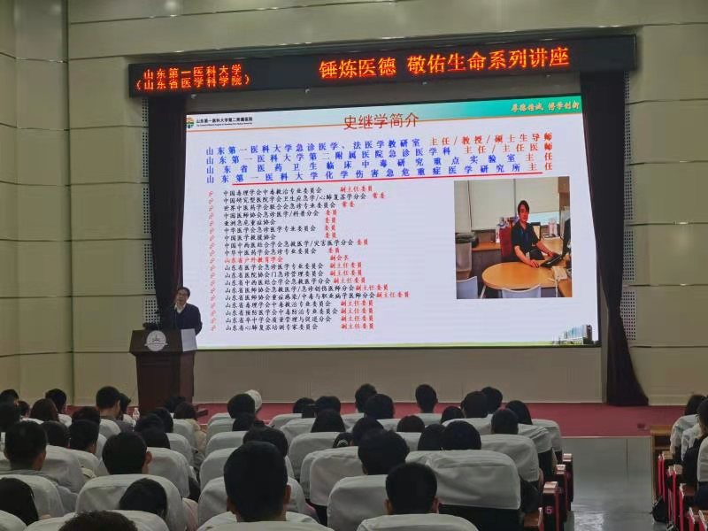 在讲座过程中,史继学教授用幽默的语言、生动的照片将同学们带进临床医学的大门,以李克强总理所讲的“青年员工要加强基础知识学习”引出医生职业素养三要素、人生之道,同时结合疫情与亲身经历向同学们讲解了作为一名医生的神圣职责,引领同学们对于医学这条遥远坎坷,而又充满挑战和成就感的道路有了更深入的了解,坚定了做一名合格的医员工的奋斗方向。史教授的精彩讲座引发现场掌声雷动、经久不息。