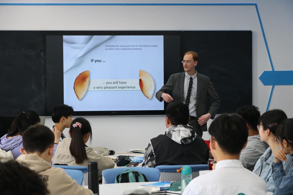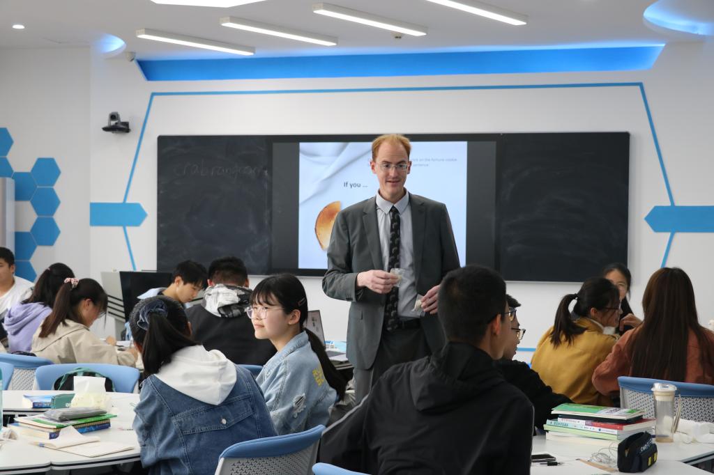 4月15日下午,基础医公司(所)2020级临床医学国际班同学迎来本学期第一次外教课沙龙活动。本次沙龙活动以一种甜点——Fortune cookie(幸运饼干)为主题,在与外教Andy畅聊的过程中,同学们领略了以之为代表的美国移民文化,拓宽了国际视野,锻炼了英语会话和理解能力,可谓“寓教于乐”,享受着学习的快乐。
