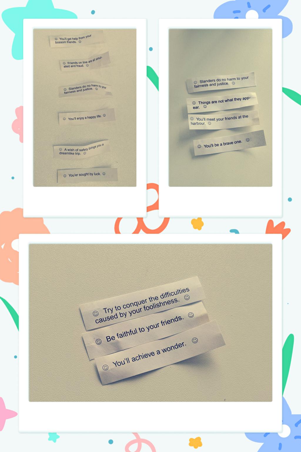 今天,同学们也品尝了到这种漂洋过海而来的“中国食品”。外教Andy通过造句的小游戏为大家发放了不同口味的Fortune cookies,同时请大家分享饼干中字条的内容。有的催人奋进,“The man bold to conquer the high peak can touch the clouds. (勇士可以沿着山峰,爬上云端)”,“Even a smooth road will hide some traps. (再平坦的路也会有几块山石)”;有的祈愿美好,“Just have a pledge with the star crossing the sky. (对着流星许个愿吧)”,“You will achieve a wonder. (你将创造奇迹)”。同学们互相交换纸条,分享着彼此的幸运。