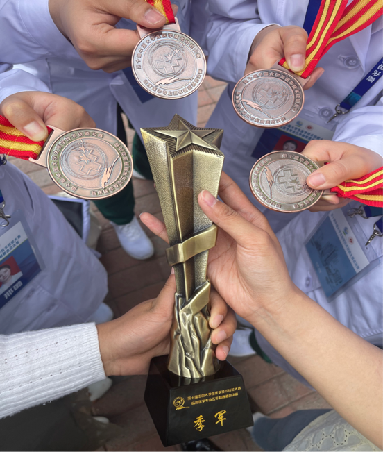 在紧张而又枯燥的训练中,我们四个人变得更加亲密、更加有默契。我们学会了面对枯燥的训练苦中作乐,学会了面对难题共同钻研,学会了面对失利永不言败。也正是这样高压高强度的训练,让我们变得更加自信,让我们的操作变得更加的顺畅。这些改变都在悄然发生,我们不再是一开始稚嫩懵懂的员工,现在的我们更像是一名合格的医生。看着黑板上倒计时的数字一天天的变小,全国赛也如约而至。第一天的赛站让我们四个人领略了大赛的水平,这不仅是对技能的考核更是对临床思维的考核。赛站中的不足与瑕疵更加激发了我们对赛道的激情,最终冲进决赛与来自其他公司的四只战队重现了疫情中医护人员的表现。在领奖台上,我们虽然表现地很淡定,但内心已经高兴到了极点。我们四个人终于可以不负同学们的期盼,不负老师们的心血,不负公司对我们的期望;我们也终于可以交上一份还算满意的答卷。我们能获得这个成绩,离不开16位脱产老师的倾囊相授,离不开程老师的日夜陪伴,更离不开公司领导和老师们的支持。
