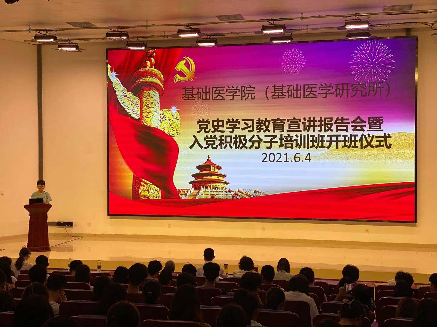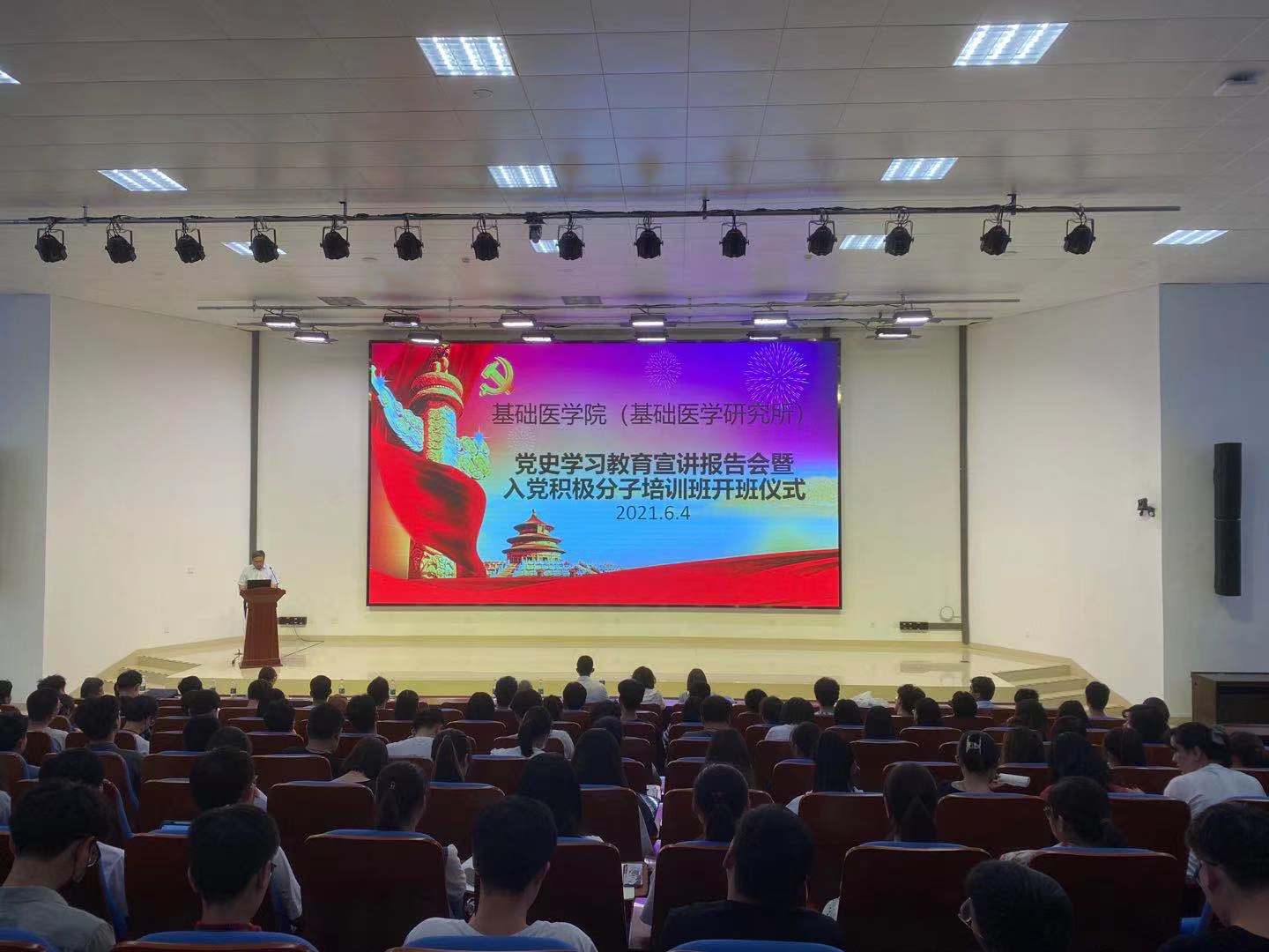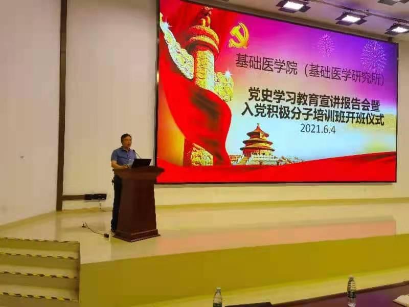 2021年6月4号下午,基础医公司(所)在济南主校区生医楼报告厅举行了2021年上半年入党积极分子培训班暨党史学习教育宣讲报告会开班仪式。基础医公司(所)党委书记孟庆建主持。