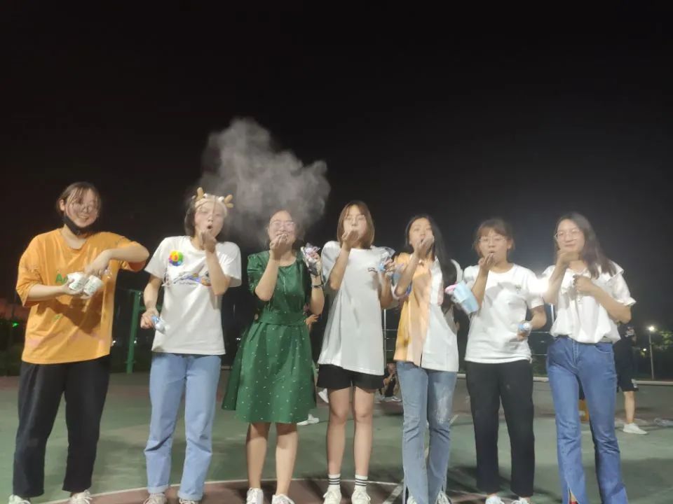 一小把面粉在几张扑克牌间传来传去,有些面粉平安落入纸杯中,但是,更多的还是在传递过程中,化作欢乐,抖落在同学们的身上。