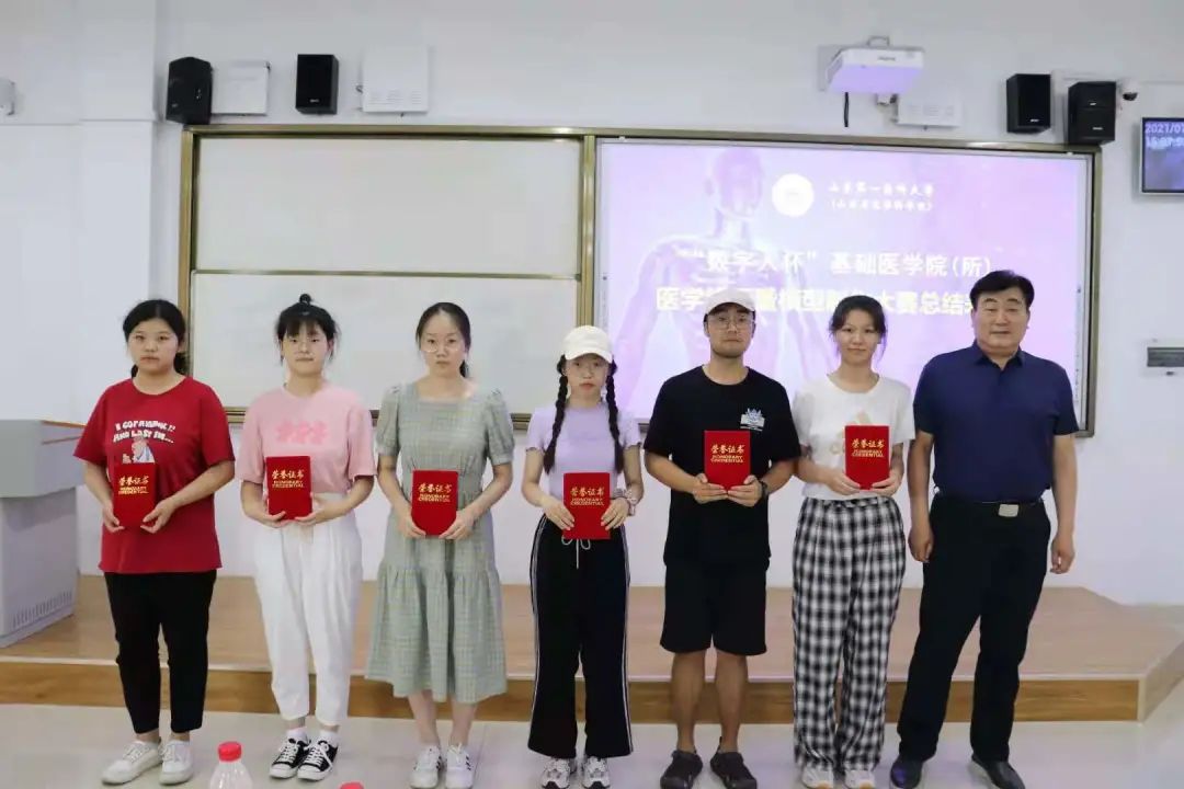 基础医公司(所)副经理于广福宣读获奖同学名单。徐以发、马鲁豫、于广福、王越、苏衍萍、赵英会分别为解剖绘画比赛、组织学与胚胎学绘图比赛、寄生虫学和微生物学绘图比赛、医学模型制作大赛获奖同学代表颁奖。