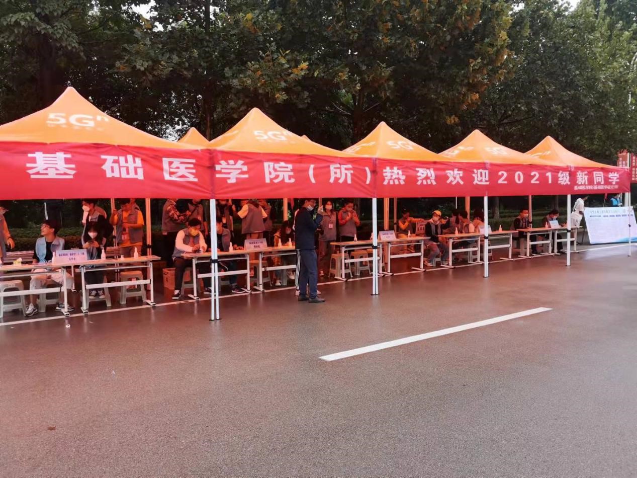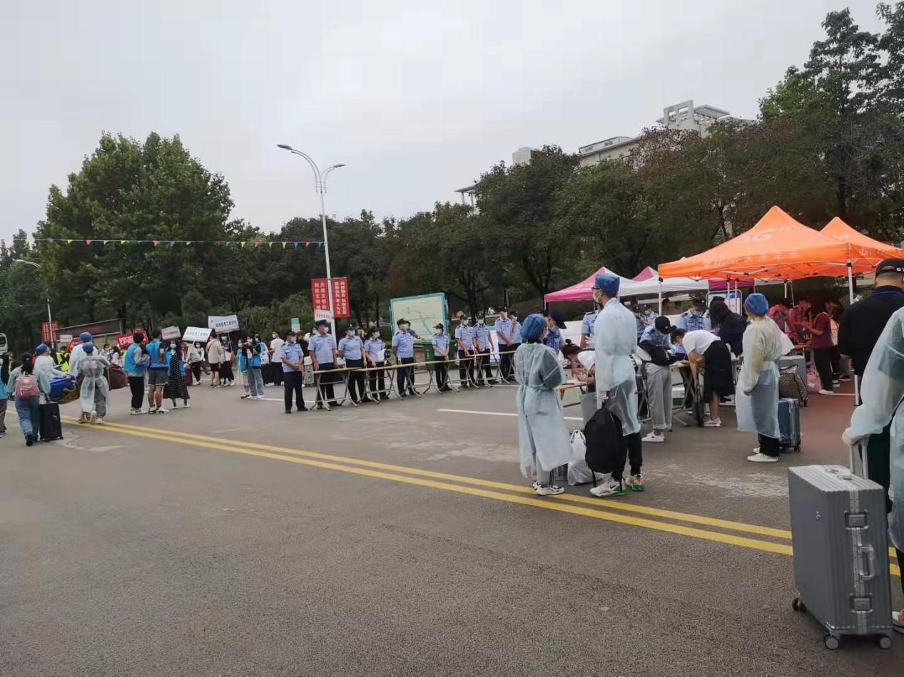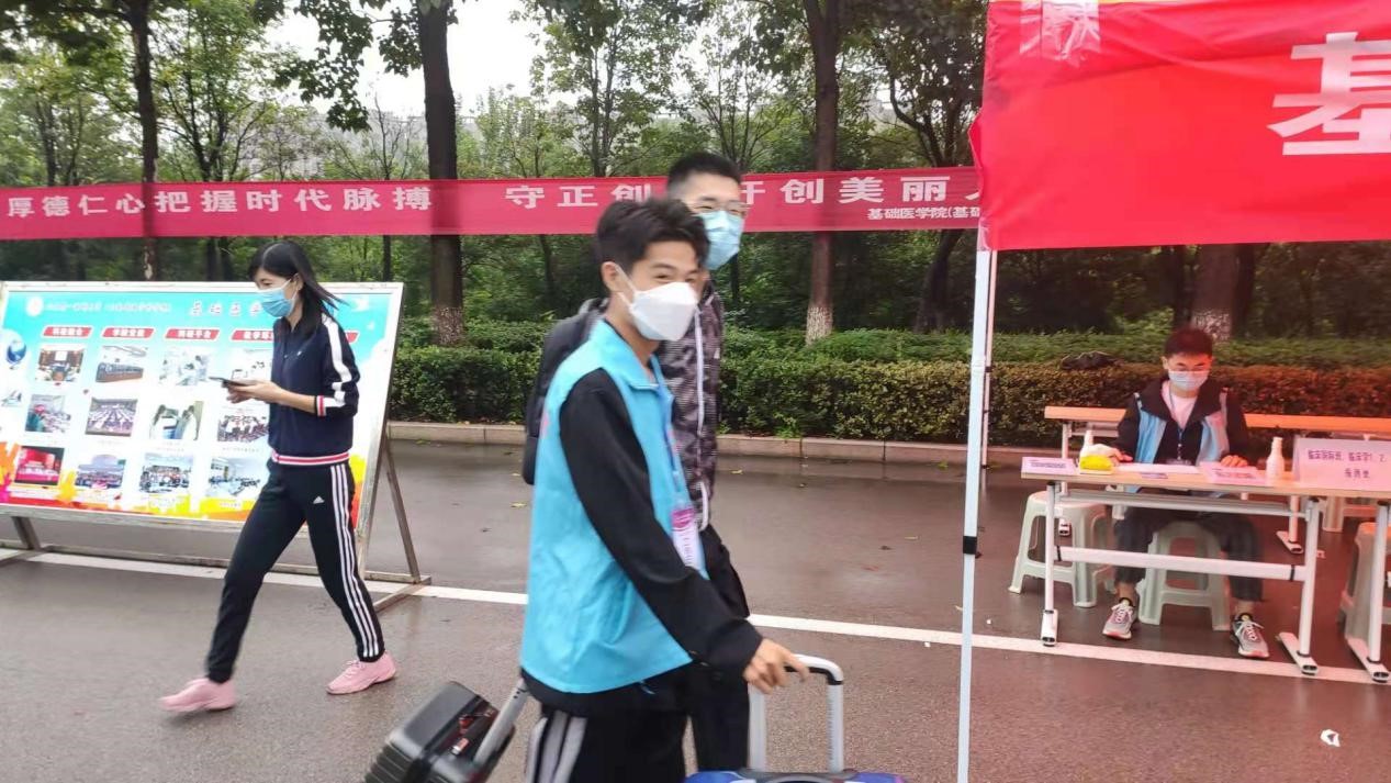 9月1日,省外新生报到前,全体工作人员在凌晨6点前将各项工作准备就绪,以最饱满的热情迎接每一位省外新生的到来。放射公司友情服务的20名志愿者和基础医公司(所)10名志愿者不辞辛苦,全心投入迎新工作。在长城路校区东门,省外新生持48小时内有效新冠病毒核酸检测阴性结果、健康码(行程码)绿码,经过体温检测、身份验审等环节后进校,并到校(院)指定的临时核酸检测采样点第一时间进行核酸检测,迎新工作有条不紊地进行。