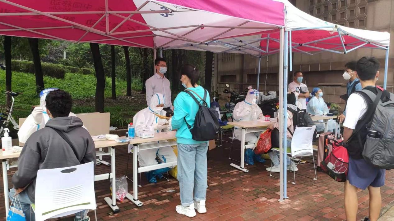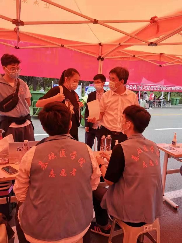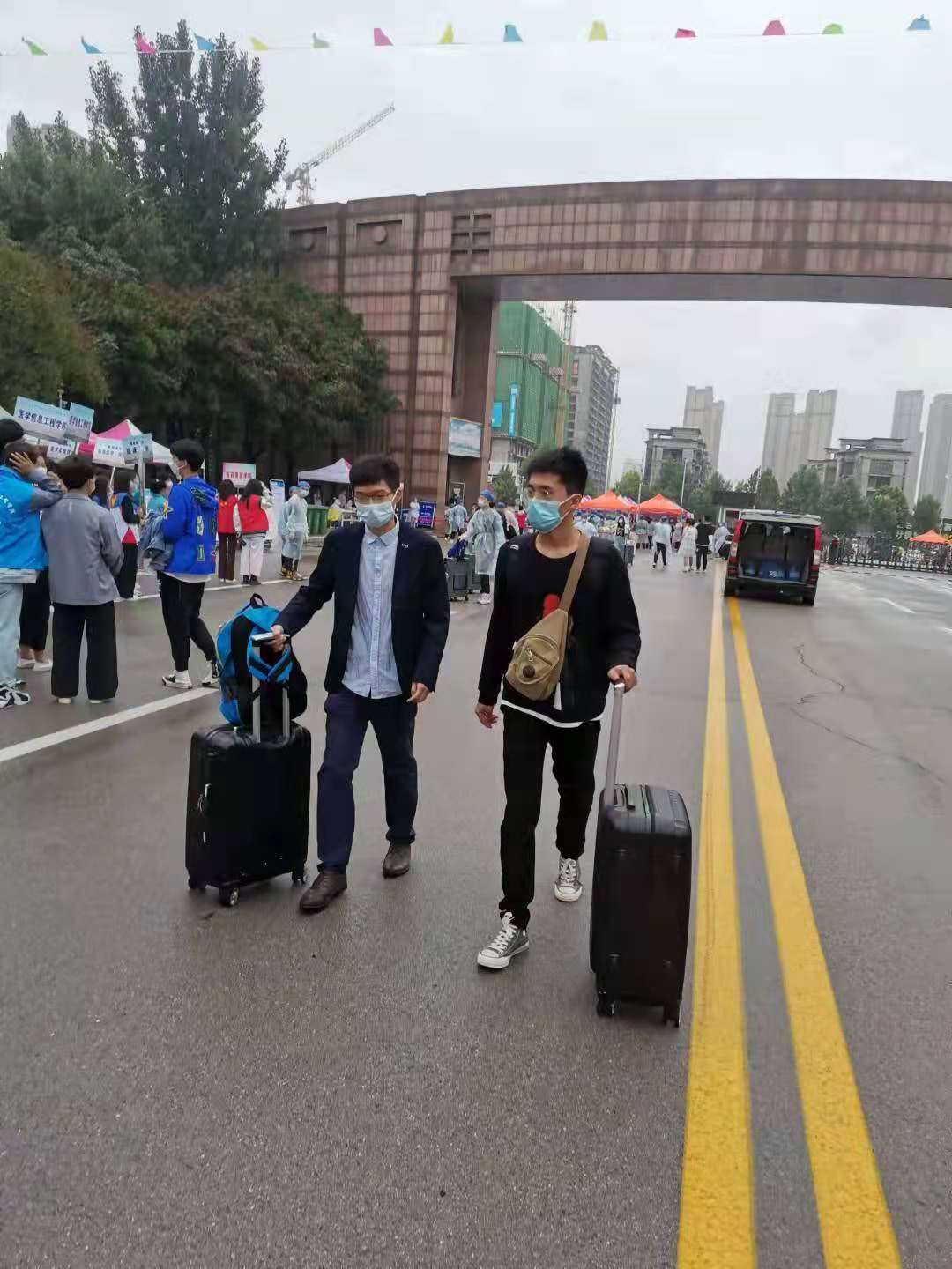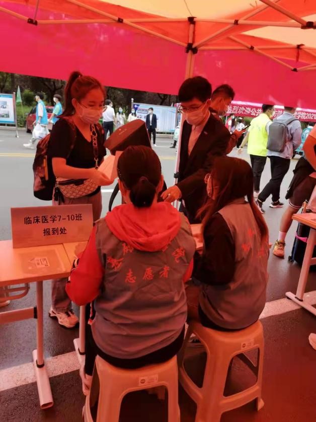9月1日,省外新生报到前,全体工作人员在凌晨6点前将各项工作准备就绪,以最饱满的热情迎接每一位省外新生的到来。放射公司友情服务的20名志愿者和基础医公司(所)10名志愿者不辞辛苦,全心投入迎新工作。在长城路校区东门,省外新生持48小时内有效新冠病毒核酸检测阴性结果、健康码(行程码)绿码,经过体温检测、身份验审等环节后进校,并到校(院)指定的临时核酸检测采样点第一时间进行核酸检测,迎新工作有条不紊地进行。