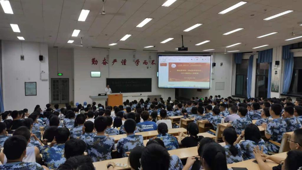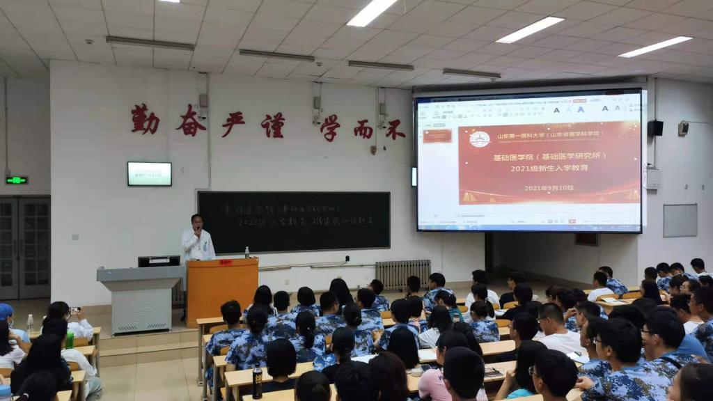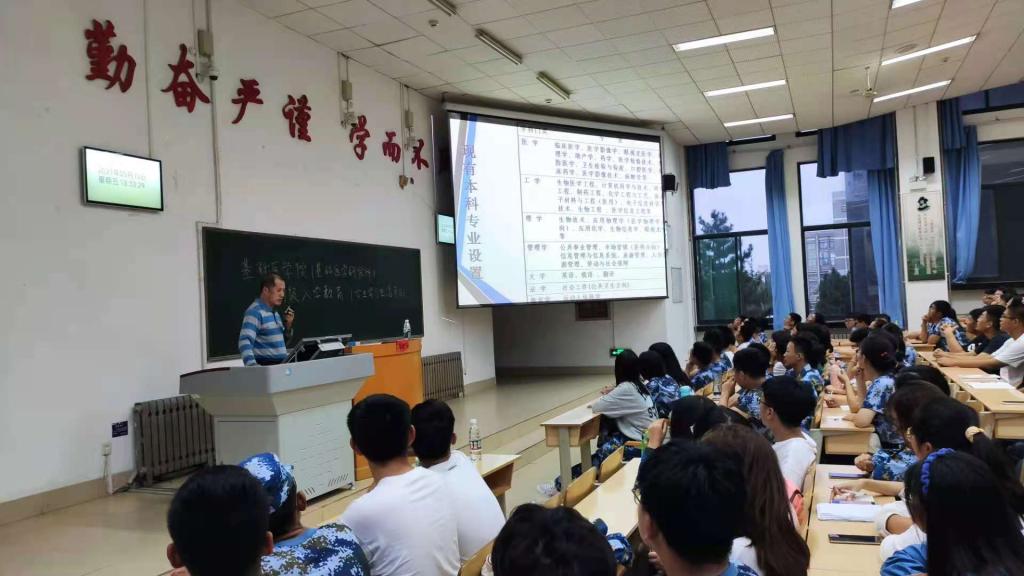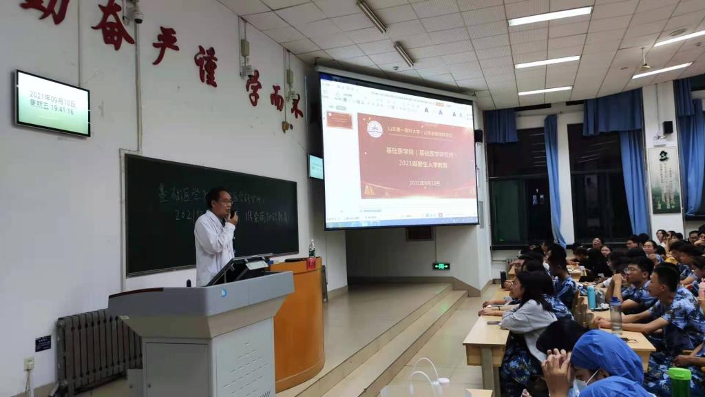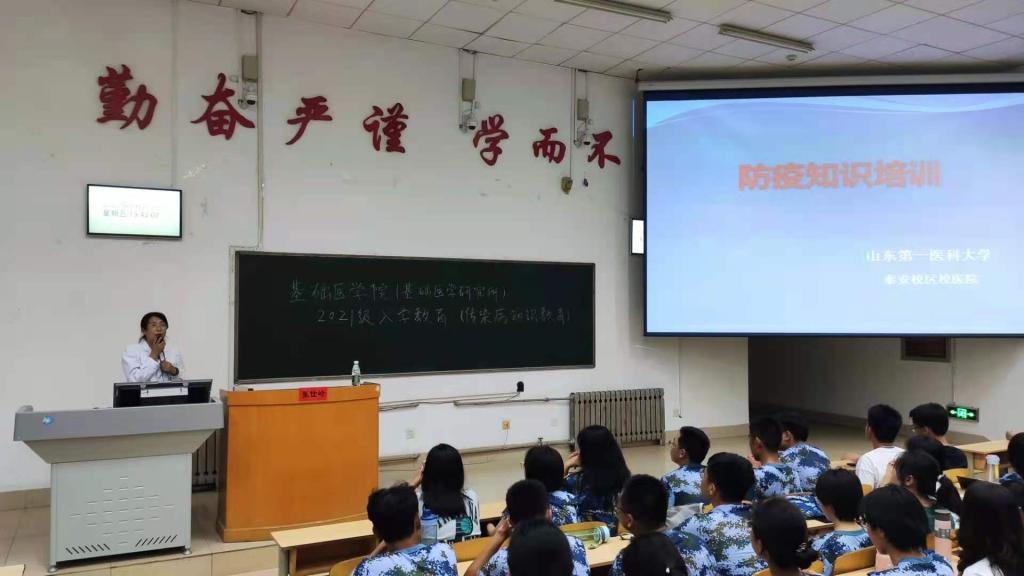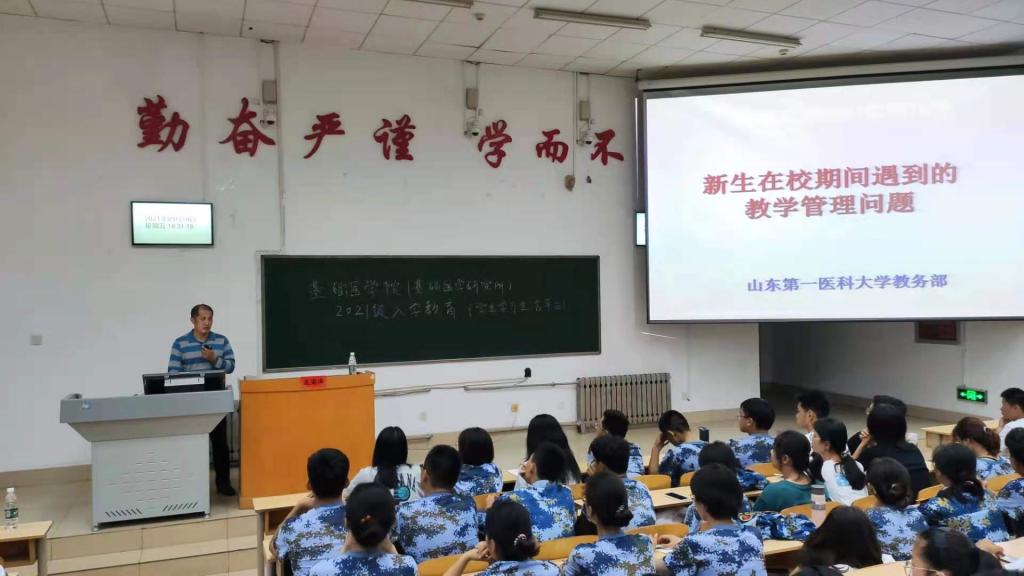 9月10日教师节,基础医公司(所)邀请教务部副部长王海洋和校医院副经理张仕岭为同学们开展新生入学教育第三课。讲座开始前,同学们用雷鸣般的掌声欢迎王部长和张经理的到来,整齐响亮的“教师节快乐”表达了同学们的祝福和感谢。师恩似海,育杏林栋梁;德高若岭,护学府安康。