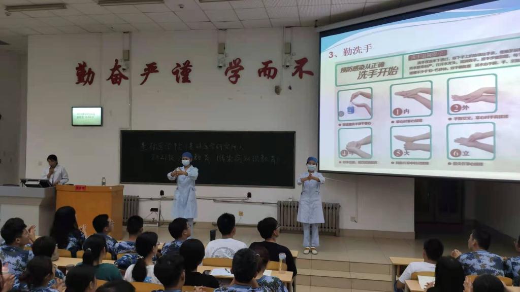 最后,校医院孙红丽老师向大家讲解了结核病的预防知识。通过介绍肺结核的感染途径、隔离措施、防治措施、预防感染、规范治疗等内容,引导同学们科学、健康、文明的预防和对待结核病,让同学们认识到结核病并不可怕,教育同学们不要歧视结核病患者。此外,校医院护理老师上台为我们展示了“七步洗手法”的流程,与同学们互动,更好的让同学们0距离感知学习。