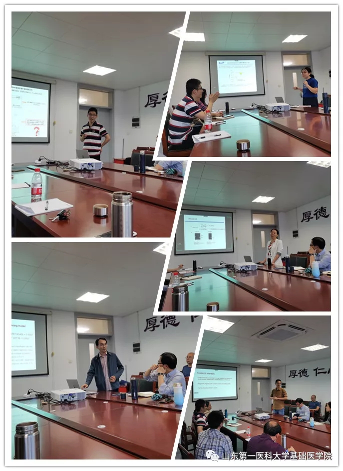 吕新星老师首先介绍了自己博士阶段的工作,然后又重点介绍了博后阶段基因组稳定性机制研究-DNA损伤修复的工作;杨笃晓老师分享了自己博士阶段蛋白酪氨酸磷酸酶结构和功能方面的研究工作;伊淑莹老师介绍了自己有关免疫性疾病分子机制方面的研究工作;叶振老师介绍了临床综合分析线粒体能量代谢通路相关基因在肺癌中的意义;张振老师就MST4表达与LPS刺激和LPS-TLR4信号调控机制进行了详细说明;针对每位老师的报告,大家进行了热烈的讨论与交流。