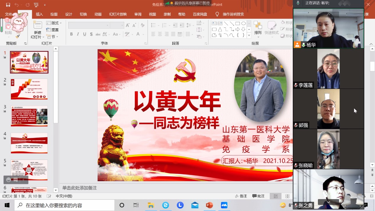 为认真学习贯彻习近平总书记给全国高校黄大年式教师团队代表的回信精神,深刻理解回信精神的重大意义,准确把握党和人民对教师寄予的殷切期望和目标要求,不忘立德树人初心,牢记为党育人、为国育才使命,免疫学系于10月25日召开腾讯线上会议,组织全体教职工集体学习习近平总书记给全国高校黄大年式教师团队代表的回信精神。