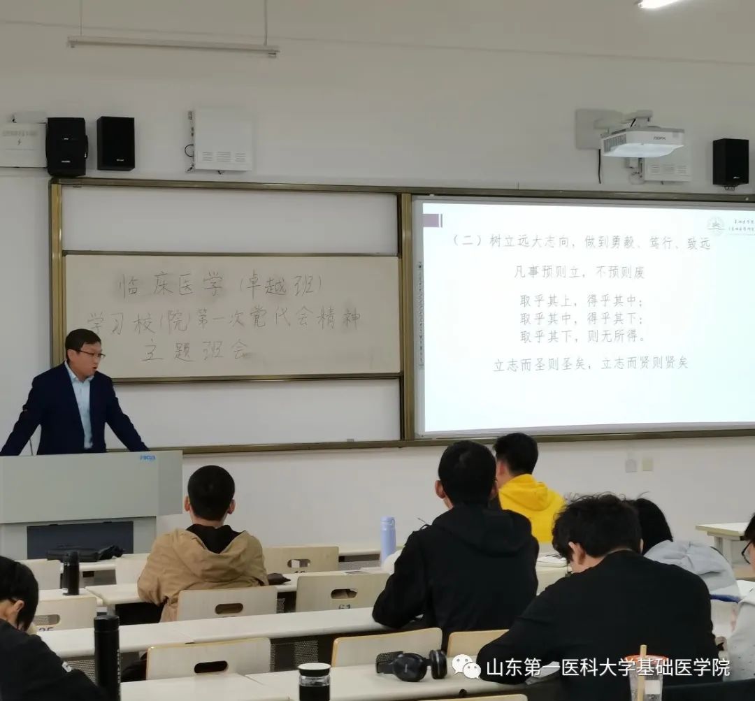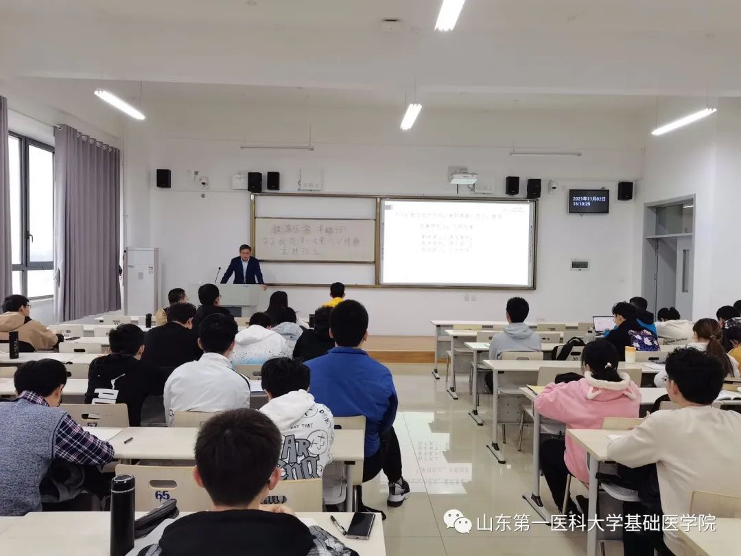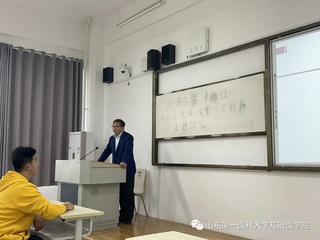 为贯彻落实三亿体育官网(山东省医学科公司)第一次党代会精神,激励医员工奋发有为, 2021年11月2日,基础医公司(所)2020级临床医学(卓越班)开展了“学习校(院)第一次党代会精神”主题班会,由院(所)党委副书记、卓越班辅导员张乃强主讲。