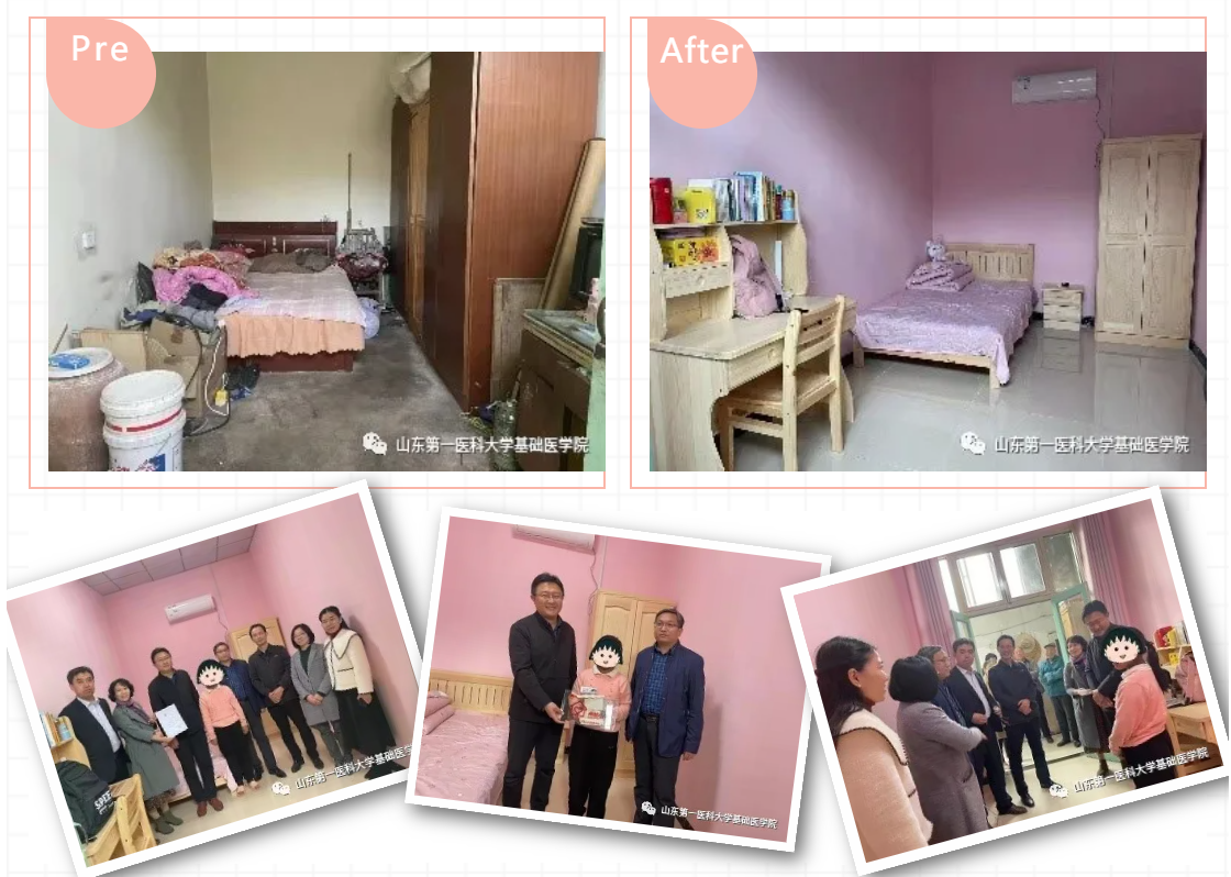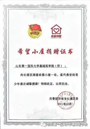 自2020年6月团山东省委、山东省青联、山东省青基会针对贫困家庭无独立居住和学习环境的8至14岁儿童全面启动“希望小屋”关爱项目以来,基础医公司(所)师生积极响应团省委和校(院)团委号召,解囊相助共同捐款打造“希望小屋”改善家庭经济困难儿童生活与学习环境,帮助孩子燃起生活希望,树立远大理想,增强学习动力,提升幸福指数,增强社会融入力。
