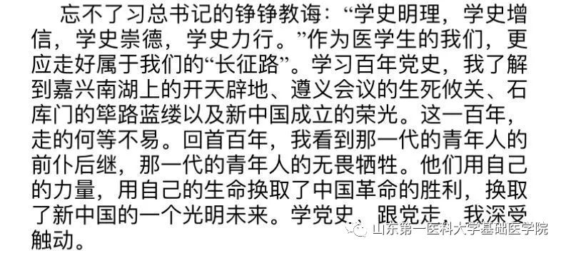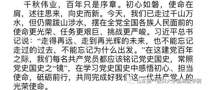 千秋伟业,百年只是序章,初心如磐,使命在肩。身为新时代的青年,我们更应以党史为镜,传承革命先烈的艰苦奋斗精神和甘于奉献的高尚品德,坚定理想信念,提高党性修养,结合所学专业,切实为祖国医疗卫生事业做出新贡献。