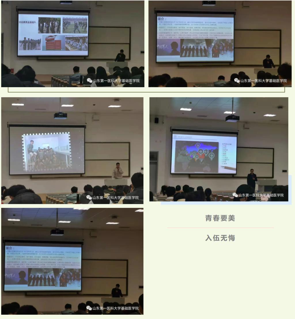 11月22、23日,基础医公司(所)济南校区召开参军入伍经验分享会。基础医公司(所)辅导员杨兴廷老师(部队转业干部)参加分享会,为同学们介绍了国家和公司对于参军入伍的优惠政策,鼓励同学们投身军营、淬炼青春。随后邀请了张字好,刘浩,朱玉崇、陈博、李杰五位同学,向同学们分享他们参军入伍的宝贵经验和难忘回忆。分享会由基础医公司(所)辅导员李佳琳老师主持。