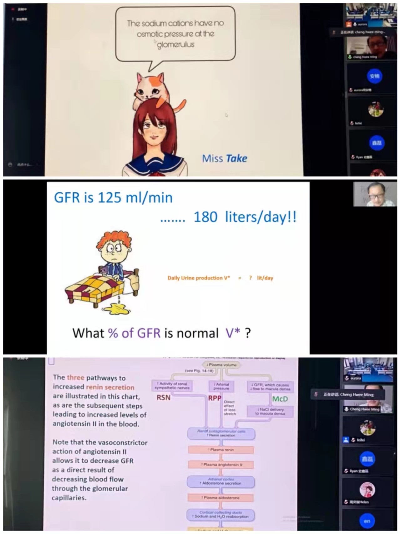 本次授课分为三次课,五部分,每堂课各有侧重。Dr. Cheng在课堂上以Claude Bernard和Walter Cannon两位科学家引入,深入浅出地向同学们解释各个生理学概念,例如ECF(Extra-cellular Fluid)和GRF(Glomerular Filtration Rate)等,用生动的描述,准确的示意图向同学们层层递进地讲述复杂的生理学内容。Dr. Cheng的教学风格深受同学们喜爱,教学课件上有很多Cartoon帮助同学们理解,还有朗朗上口的生理歌曲,帮助同学们易于记忆生理学知识。