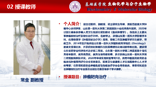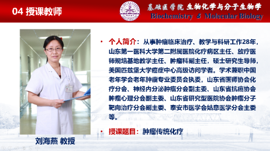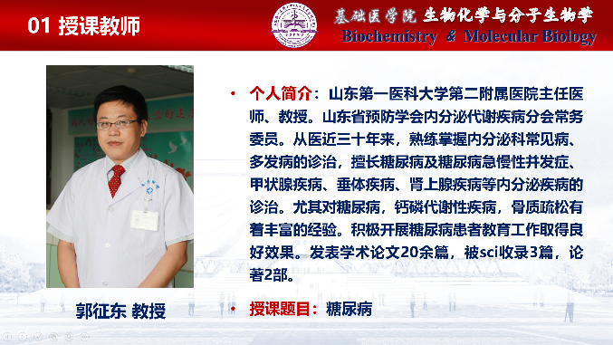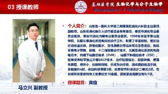临床医学专业《生物化学》课程2019年获批山东省线下一流课程,2020年《生物化学》和《分子生物学》课程均获批山东省线上线下混合式一流课程。鉴于学系部分授课教师为非医学背景团队,教学科研任务重,难以保证去临床一线进行学习,为提升校内授课教师的医学能力,使教学团队所具备的理论知识和实践能力可以覆盖课程教学目标;也为丰富课程资源,提升课程建设质量,基础医公司(所)和生物化学与分子生物学系特邀请三亿体育官网附属医院11位临床专家对课程密切相关疾病进行系列培训和指导。