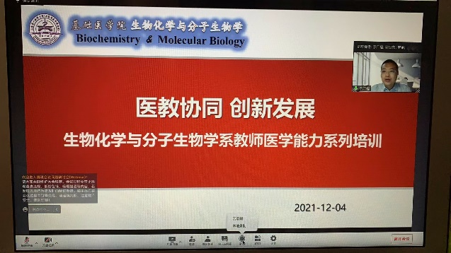 本次线上案例授课在腾讯会议举行,由生物化学与分子生物学系主任张媛英主持,基础医公司(所)副院(所)长于广福为本次培训活动致辞,表达了对于基础与临床贯通式授课方式的赞赏,鼓励学系在一流课程建设、融合团队培养方面大胆尝试,勇于创新,不断提升学系的人才培养质量水平。