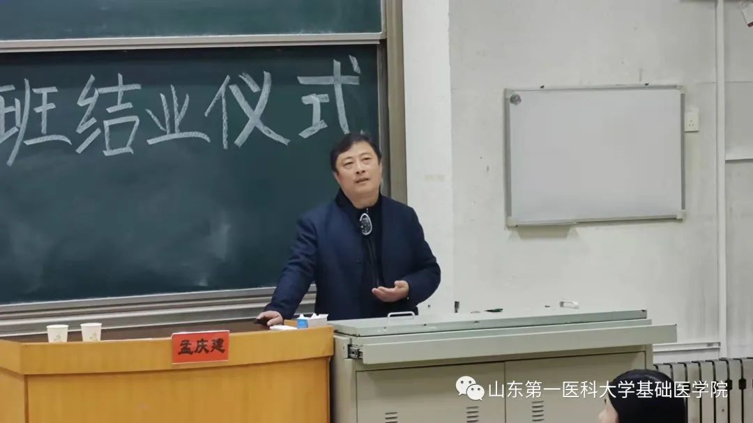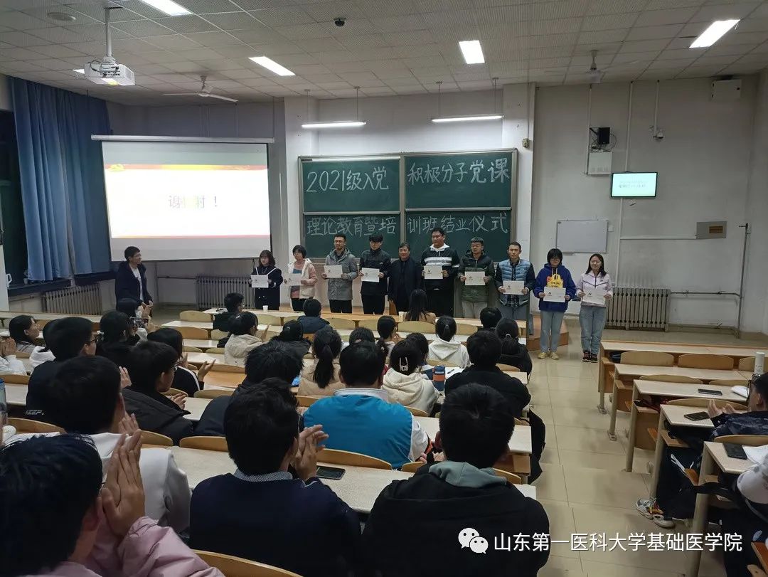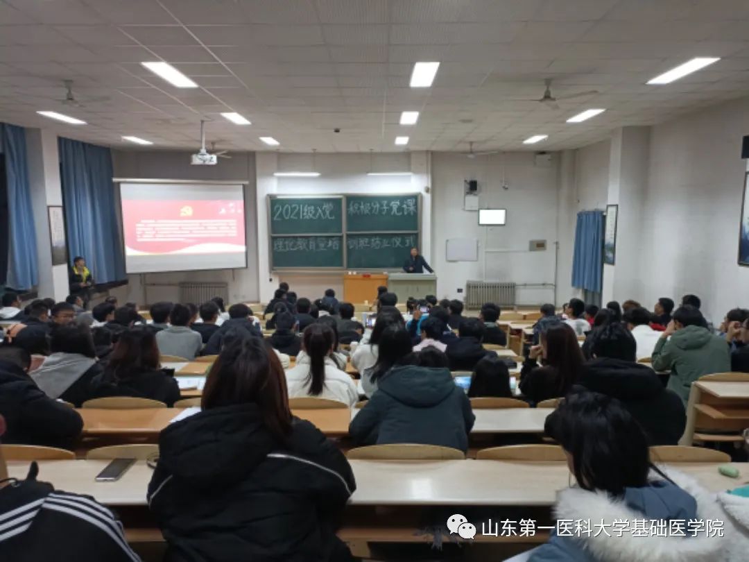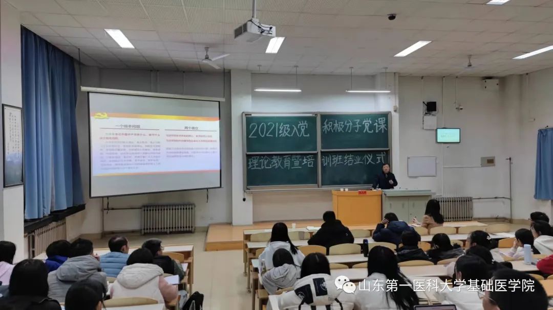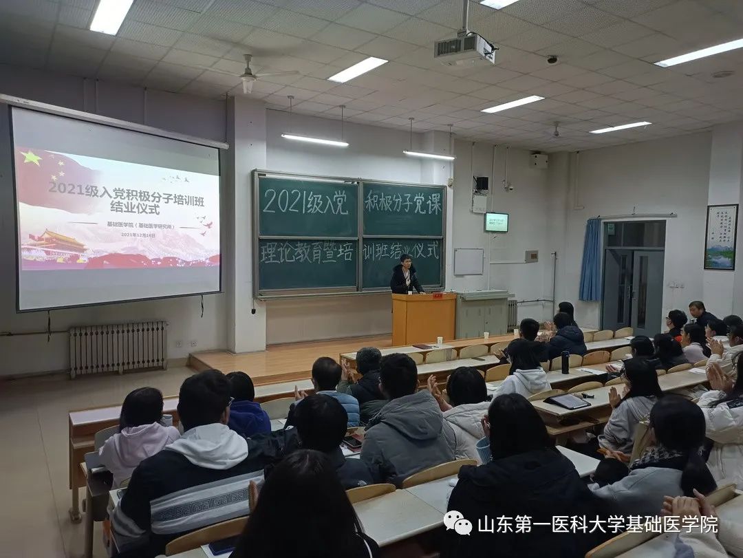 12月16日晚,基础医公司(基础医学研究所)2021级入党积极分子党课理论教育暨培训班结业仪式于泰安校区教学北楼A3006举行。基础医公司(所)党委书记孟庆建为2021级入党积极分子进行党课理论教育。员工工作办公室主任侯瑞刚,2021级辅导员杨成飞、王萍,以及2021级员工党支部全体入党积极分子参加了本次活动。
