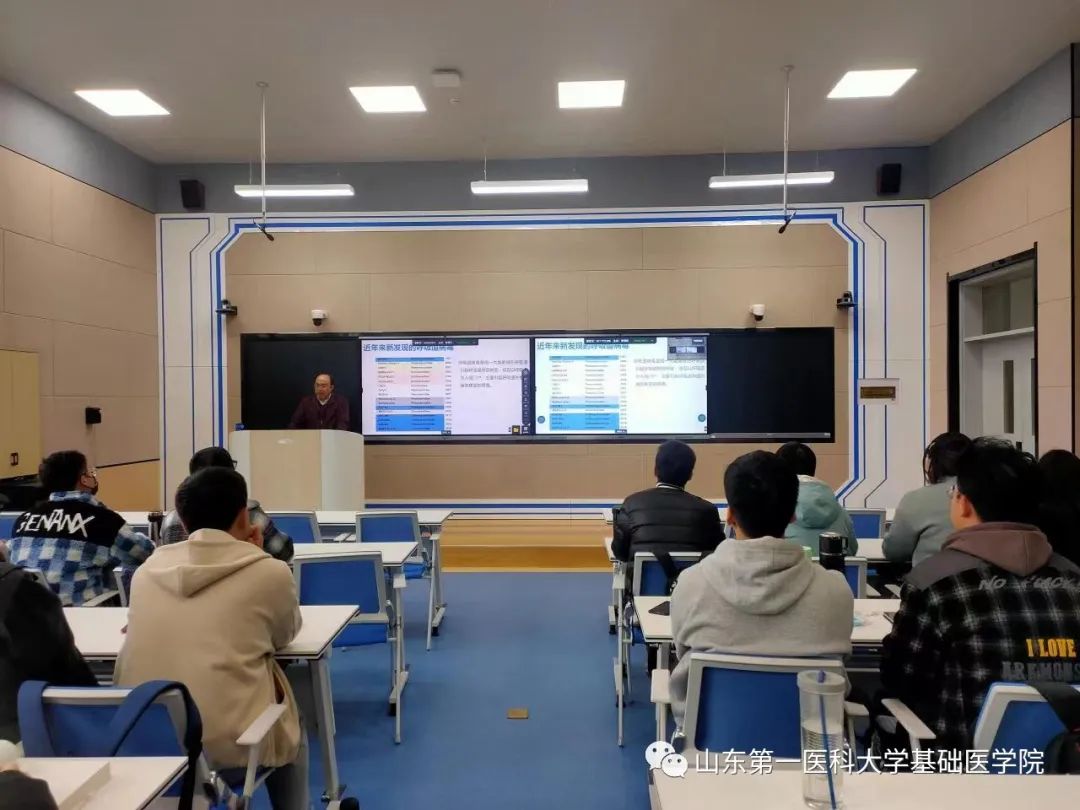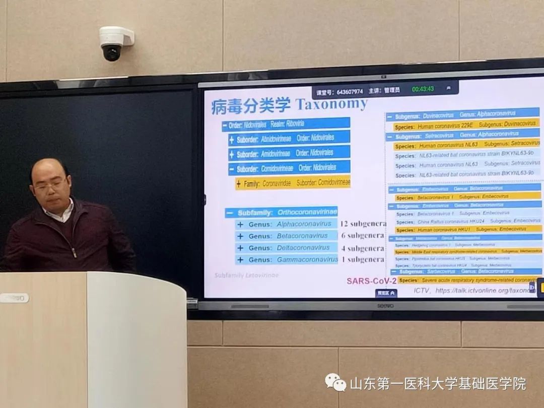 3月4日,张磊亮研究员为基础医公司(基础医公司研究所)全体本科生和研究生讲授了有关新冠病毒的“开学第一课”。课程以线下、线上两种方式进行,2019级卓越班全体同学和部分研究生代表现场聆听了课程。