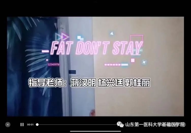 在减肥当道的时代,脂肪成为减肥人士的眼中钉。“狂吃不胖”队从脂肪代谢的过程中获得灵感,借用歌曲《stay》的伴奏进行二次创作。她们创作的《Fat don't stay》节奏明快,韵律和谐,通过演唱脂肪代谢的机理,教会我们如何重演瘦子的时间。歌词风格鲜明,朗朗上口,在各歌曲中别具一格,独树一帜。“狂吃不胖”队的成员们以音乐的形式,生动形象地向我们展示了脂肪代谢的途径,最终在比赛中斩获二等奖!