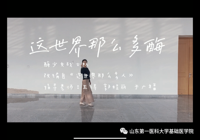 知识与艺术交织,将会擦出不一样的火花,酶少女战士队的作品《这世界那么多酶》,将生化知识与舞蹈和音乐结合在一起,以崭新的形式,将《这世界那么多人》这首歌曲展现在观众的眼前。悠扬婉转的歌声,优雅的舞蹈同酶少女们精彩的展现力一道,展现出不一样的风采。最终在第五届金斯瑞全国生化歌曲大赛中,得到老师们的一致好评,斩获全国特等奖!