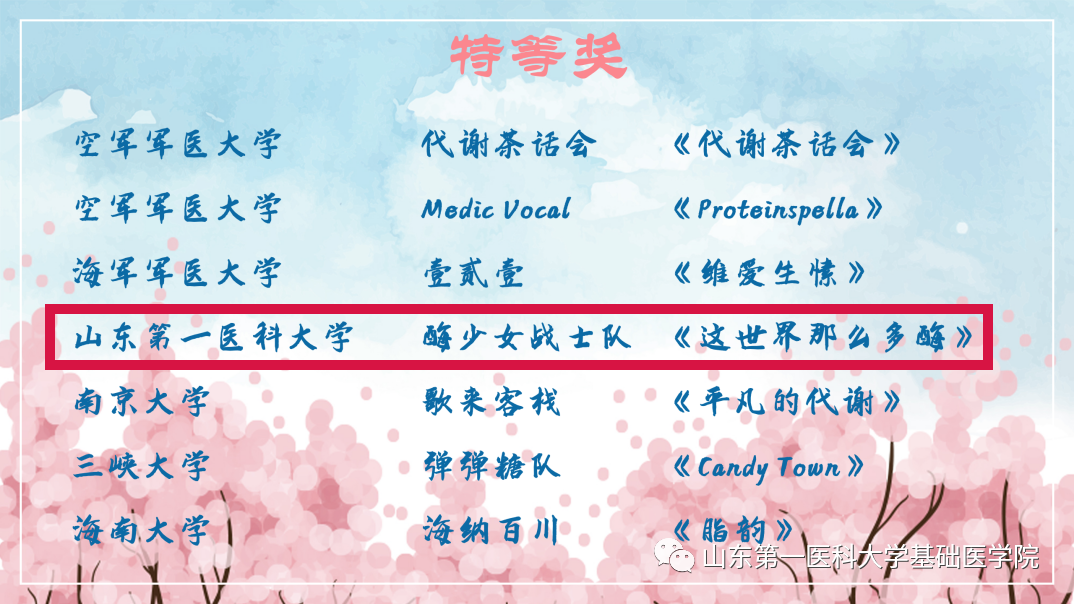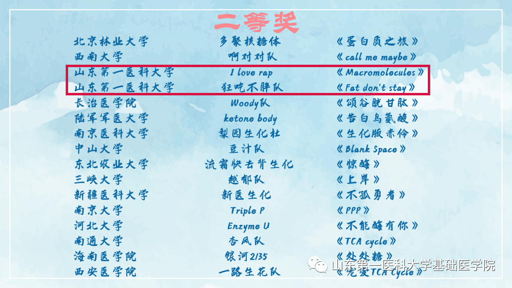 本次比赛公司参赛的三首歌曲表现优异,荣获特等奖一项,二等奖两项。获得特等奖的是2020级临床医学卓越班本科生王艺茹、岳云第、郝诗琪、许蕾、王方程组成的“酶少女战士队”带来的《这世界那么多酶》;获得二等奖的是2020级临床医学九班本科生王卓群、于昕禾和宋梦烛组成的“狂吃不胖队”带来的《Fat don't stay》和职工Emmanuel fillie等组成的“I love rap队”的《Macromolecules》。