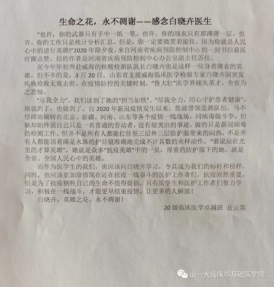 我们痛心于白晓卉医生的离去,我们更懂得,只有努力学习,回报国家才对得起你们的“最美逆行”。疫情的阴霾遮挡不住英雄的光辉,因为有你们,即使再强大的敌人也会被打败。