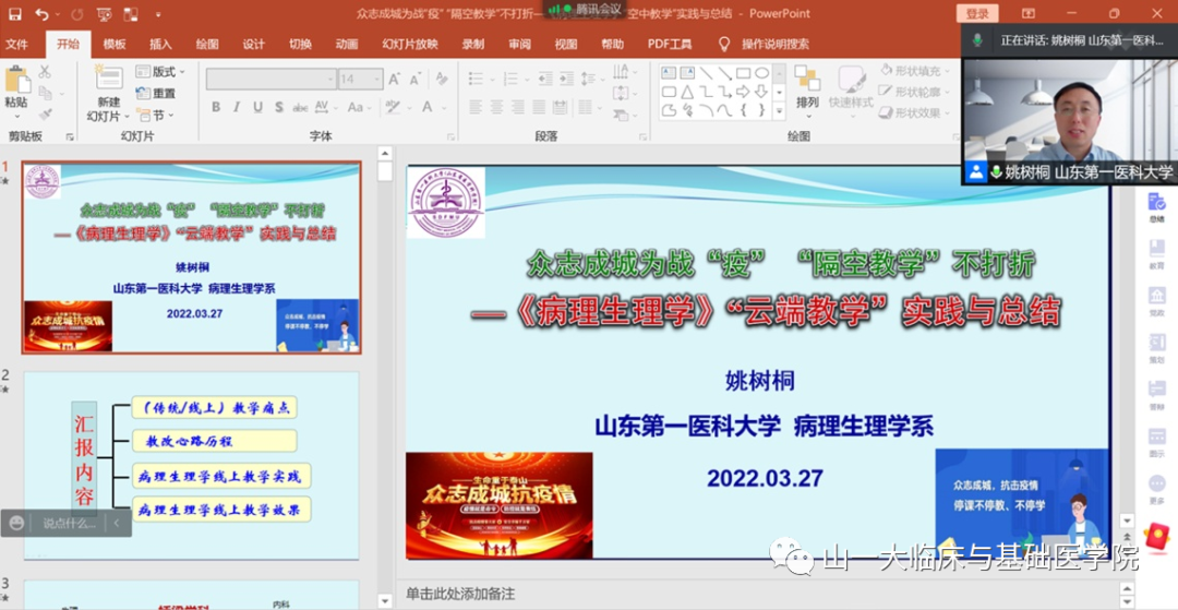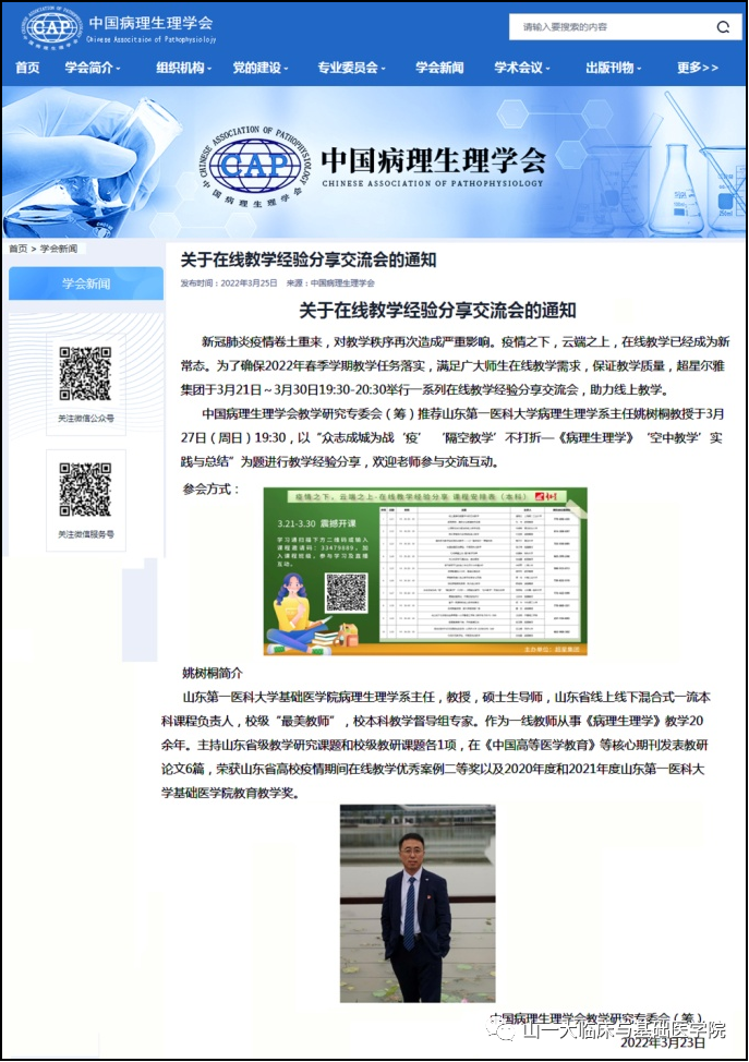 3月27日19:30,病理生理学系主任姚树桐教授应超星尔雅集团邀请,通过腾讯会议以“众志成城为战‘疫’ ‘隔空教学’不打折—《病理生理学》‘云端教学’实践与总结”为题进行了线上教学经验分享。本次教学经验分享活动得到中国病理生理学会教学研究专委会(筹)的高度重视,并以学会名义向全国病理生理学专业教师推荐。