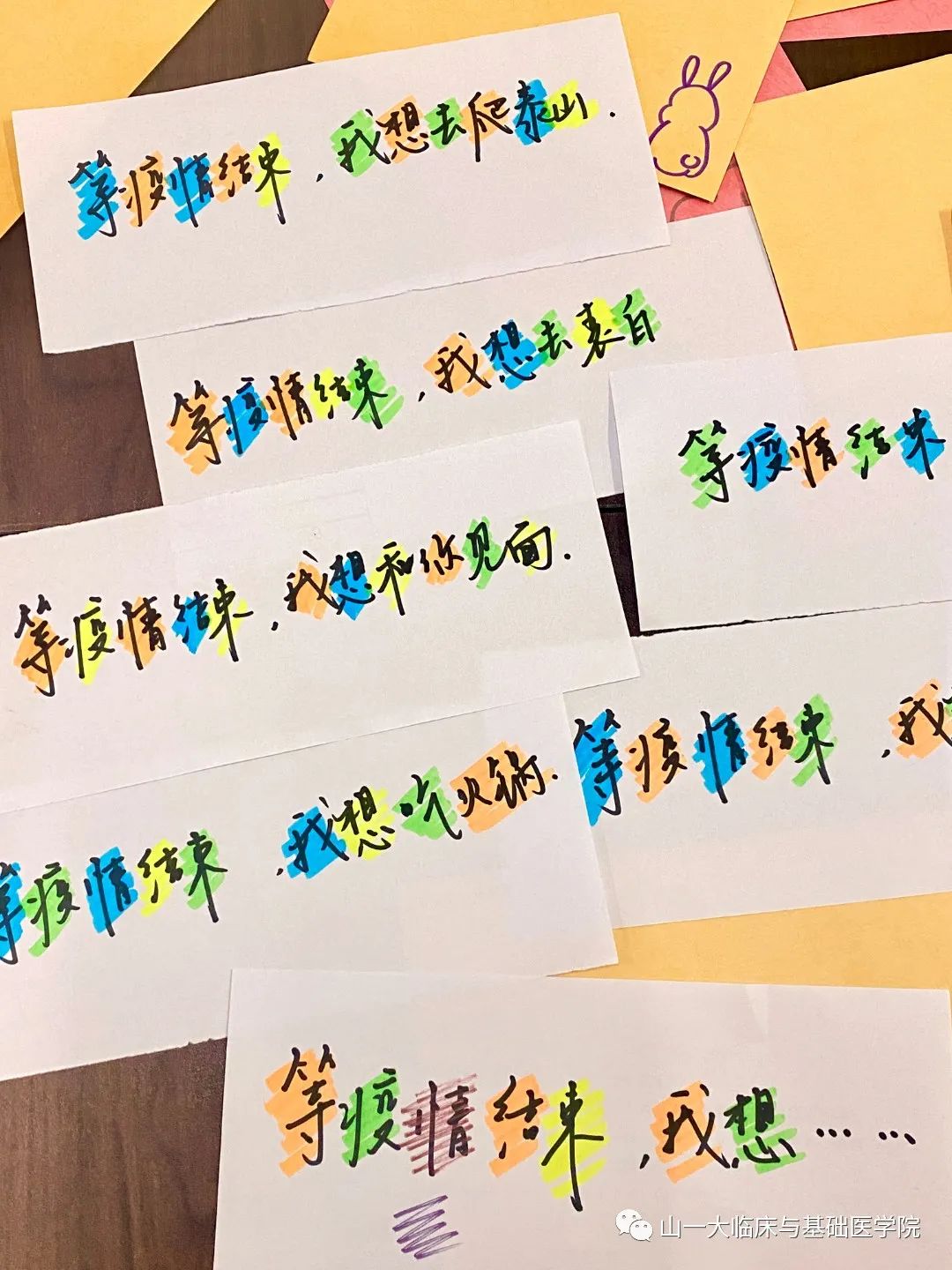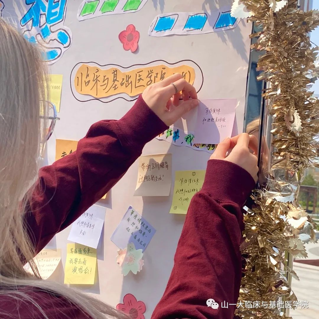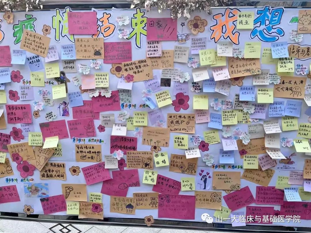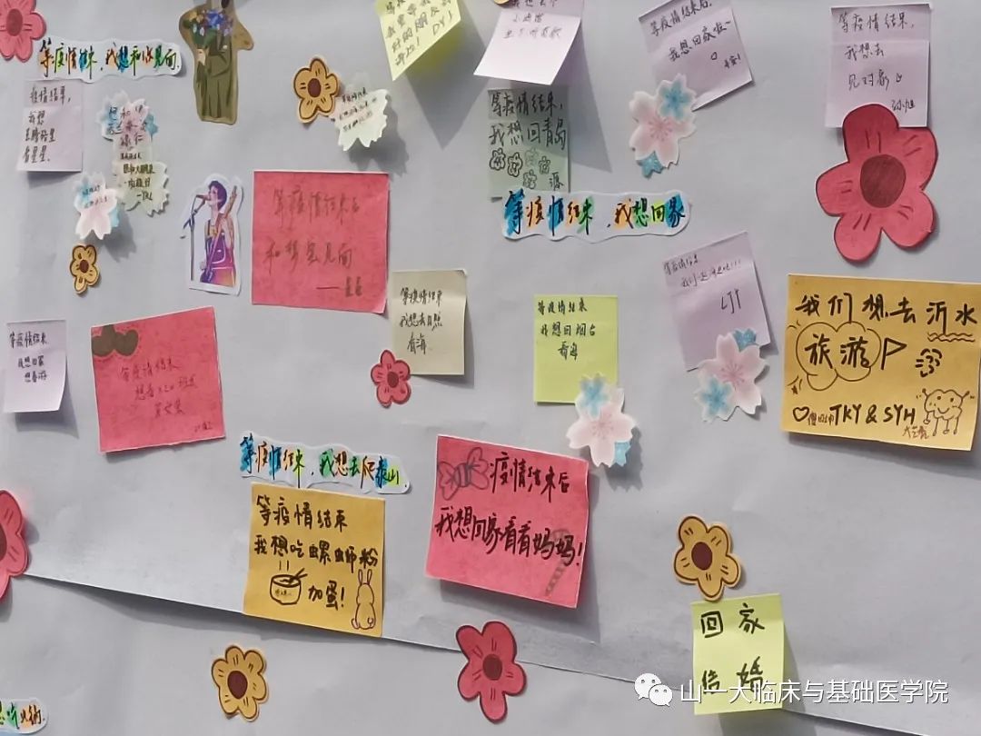 员工会秘书处的同学提前准备好了白板、便签、彩笔等活动所需材料及备用口罩、免洗消毒液等防疫用品。在热烈的讨论和书写声中活动拉开帷幕。路过的同学们或是驻足拍照,或是拿起笔在一张张纸上书写下一个个简单而又真挚的心愿,“疫情结束之后,一定要好好出去玩、去吃好吃的、去泉城广场看花、去见男朋友/女朋友、去和好朋友旅游……”。还有同学在精心裁剪的卡片上画出可爱的小气球、派大星、海绵宝宝等图案,使整块白板被装扮得光彩夺目。