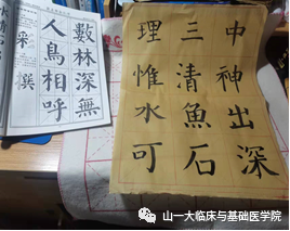 别看他们穿上白大褂,俨然一副医生的模样。当他们脱了白大褂,拿起毛笔,铺开宣纸,提笔运气,活脱脱地是一个个小书法家。书法有利于静心安神,如果在疫情期间感到心浮气躁,练练毛笔字不失是一种好方法。