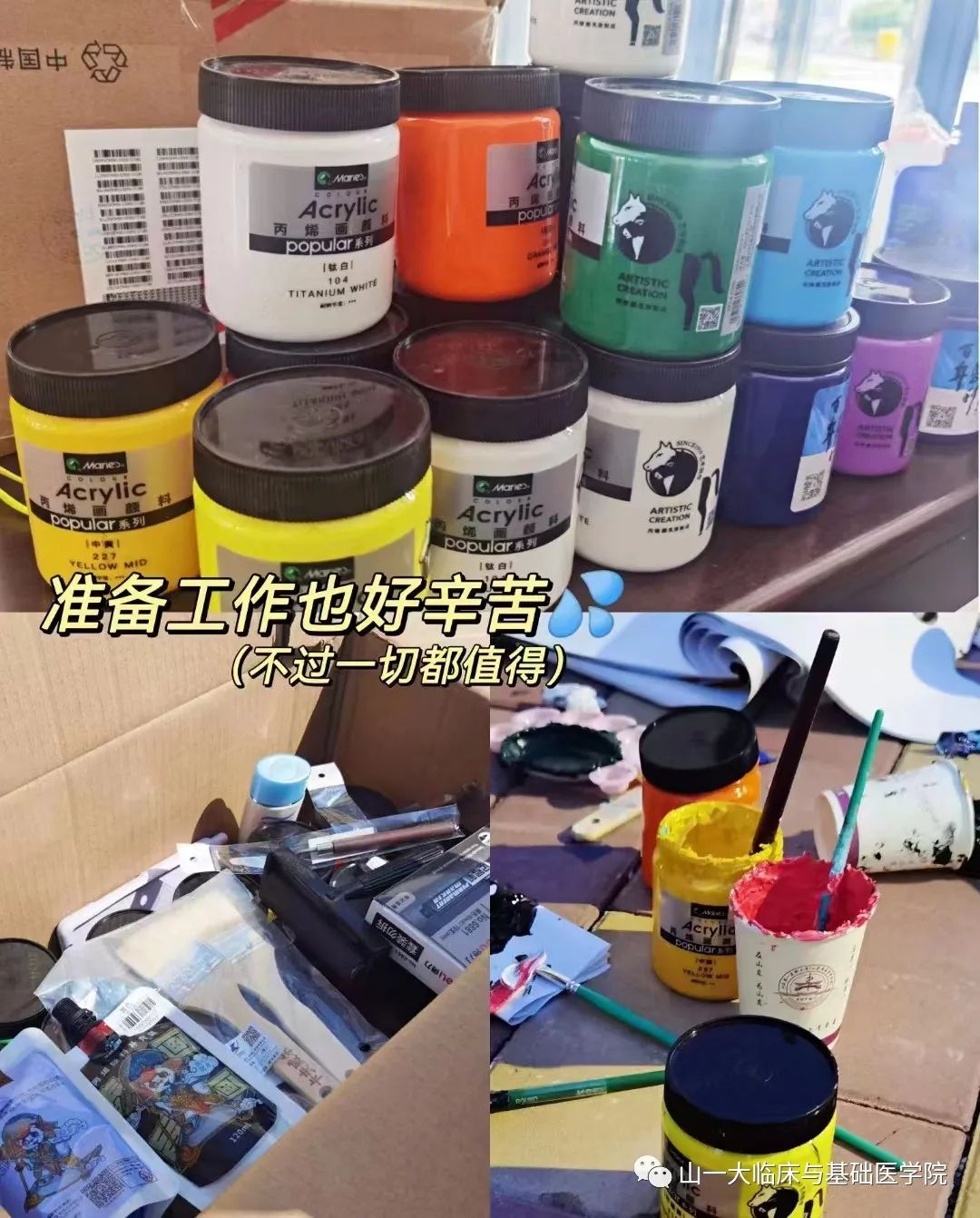 经过共同努力,团队成员不负众望,最终高质量完成墙绘任务。活动结束后,同学们都如释重负,一位同学评价道:“墙绘工作就像马拉松比赛一样,整个过程让参与者精疲力尽,但也更能体现大家持之以恒的精神。真的是痛并快乐着!”酷暑虽未至,高温已到来,吃苦耐劳的同学们怀揣着一腔热血,以笔为刃,在白墙上书写青春。同学们运用蒙德里安绘画特点、埃及壁画艺术特征与医学、科研元素相结合,呈现出一幅别具匠心、引人入胜的作品。