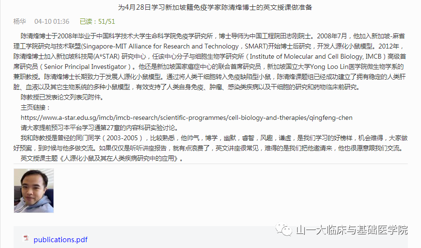 为了保证教学效果,杨华老师提前通过学习通线上教学平台,发布课程通知,提供了陈教授在新加坡科技研究局(A*STAR)的个人主页,已发表文章列表,以备大家熟悉陈教授的科研背景。