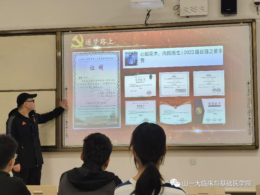 随后,李贺同学又向大家介绍了自己获得国家励志奖学金,被评选为自强之星等多项荣誉的经历;不但如此,他还不断地向党组织靠拢,成为入党积极分子;并接受了山东教育频道的采访,积极地向社会弘扬正能量。“生命以痛吻我,我却报之以歌”被李贺同学用实际行动完美诠释。