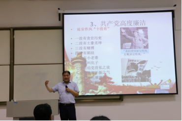 此后,许彦彬教授为大家做了题为《中国共产党为什么能?》的辅导讲座。许教授从五个维度论证了中国共产党为什么能:为什么没有共产党就没有新中国、为什么共产党能走在时代的最前沿、为什么共产党能经得起风浪、共产党为什么能得到人民的拥护、共产党为什么能永葆青春。许教授结合百年党史,以朴实的语言、生动的事例为大家做了精彩讲解,给同学们留下了深刻印象,会场里响起经久不息的掌声。