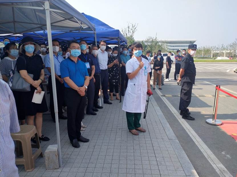 现场实战演练了开学返校员工报到检测流程,分别在餐厅、教室和宿舍等区域模拟了出现体温异常等相关症状员工的应急处置方法。公司领导仔细聆听、认真记录,就可能出现的各种问题和处理细节进行询问和交流。