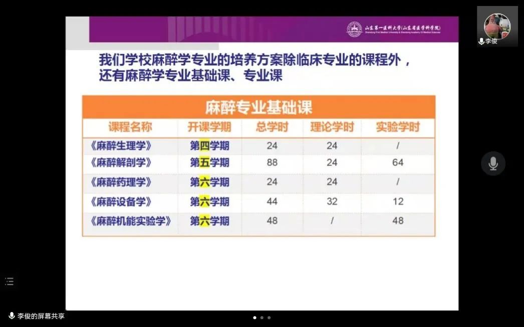 王丹丹介绍了基础医学相关学系(教研室)任课老师情况,完成麻醉解剖学、麻醉生理学、麻醉机能实验学、麻醉药理学、麻醉设备学5门课程对接落实。要求按照课程大纲完成教学目标,符合培养方案教育标准,强调规范落实教学工作,持续评价教学质量。