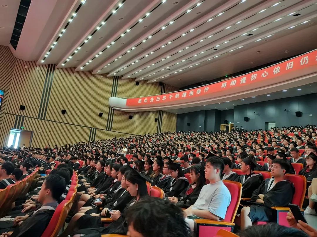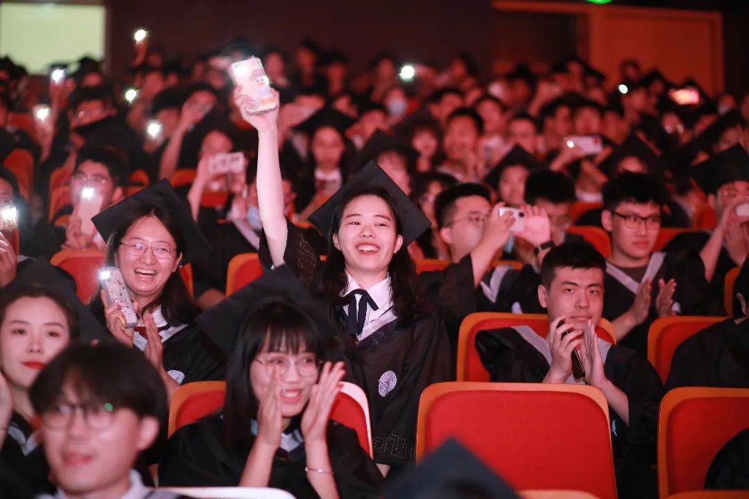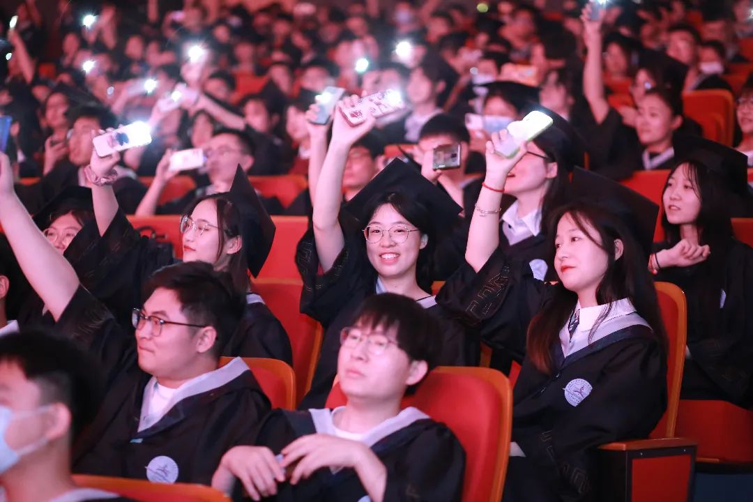 典礼伊始,同学们依次有序地入座,一段温暖动人短片带同学们追忆往昔在校四、五年的美好流年。范嘉铭同学的一首《红日》,瞬间点燃全场;焦剑桥同学的一首《New Boy》,歌颂了未来生活的美好,鼓励我们直面未来,不断向前;宋晓莹同学的一首《云烟成雨》,诉不尽临别前的依依不舍;曾福东同学的一首《光辉岁月》,说不完走向展新旅程的坚定和勇敢。伴着同学们手里挥舞的闪光灯,两首合唱曲目《后来》、《七里香》将现场气氛推向了高潮。