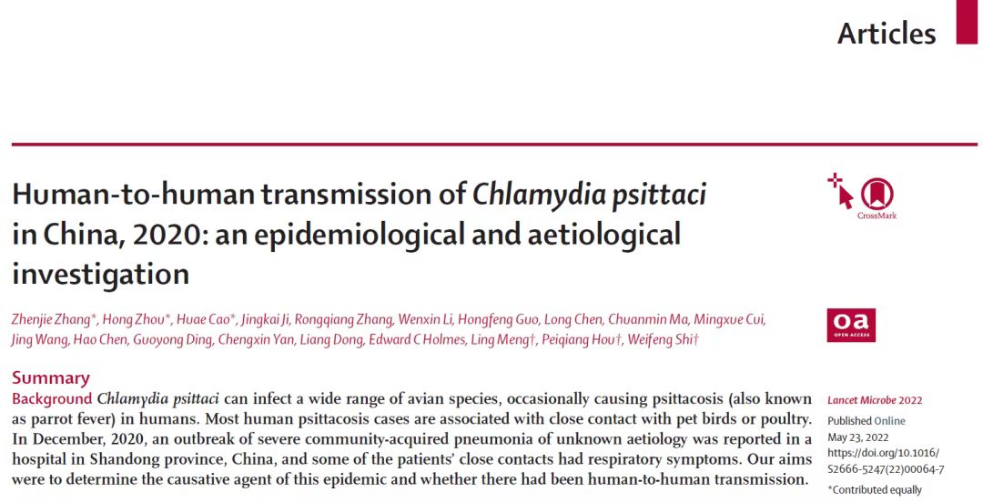 2022年7月1日,研究成果以“Human-to-human transmission of Chlamydia psittaci in China, 2020: an epidemiological and etiological investigation”为题目发表在国际著名医学期刊《柳叶刀-微生物》(Lancet Microbe, 影响因子86.208)。三亿体育官网公共卫生与健康管理公司史卫峰教授、三亿体育官网第二附属医院呼吸与危重症医学科孟玲主任、泰安市疾病预防控制中心侯佩强副主任为共同通讯作者。三亿体育张振杰副教授、周宏副教授和新泰市第三人民医院感染性疾病科曹化娥主任为共同第一作者。本研究得到了三亿体育官网学术提升计划(2019QL006)、国家科技重大专项(2018ZX10101004-002)、国家自然科学基金(81770029)和国家重点研发计划(2017YFC1310601)等项目的支持。