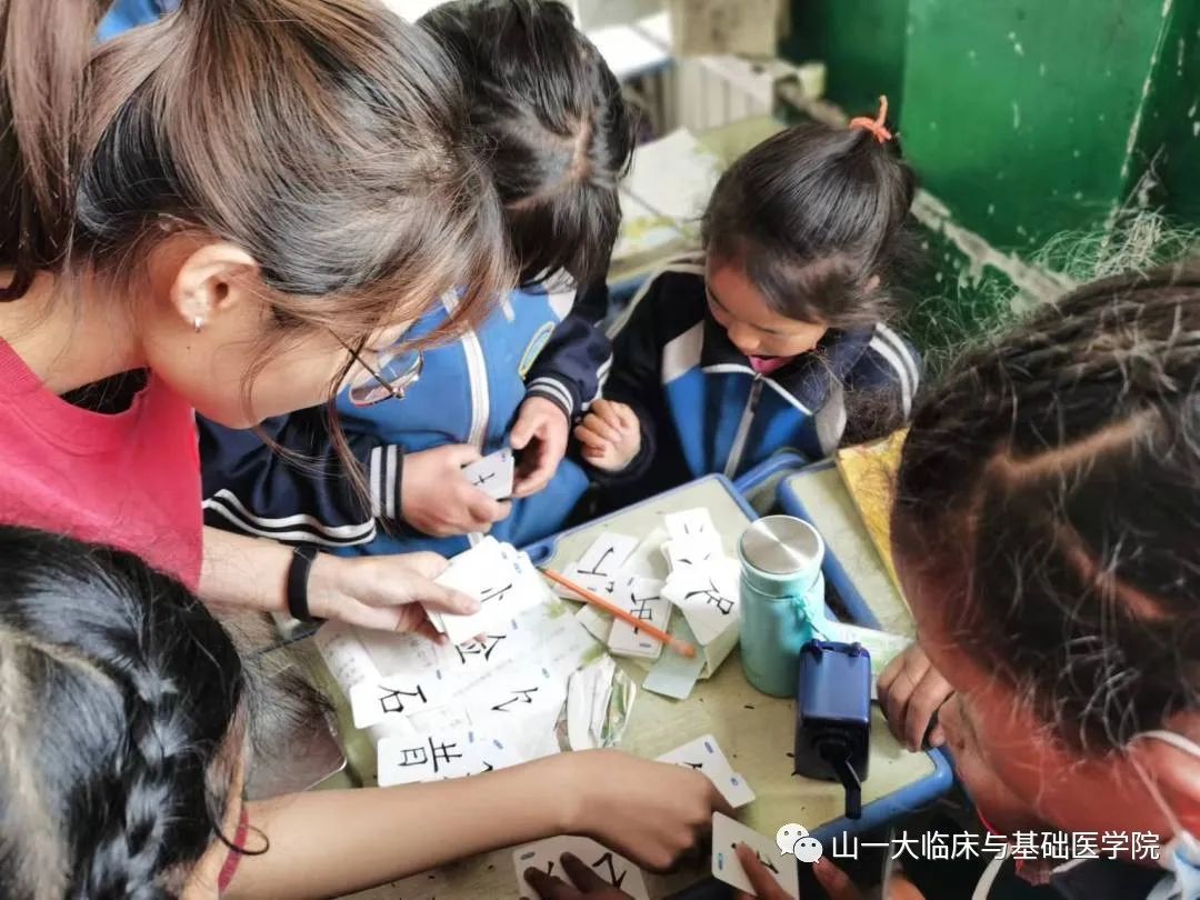 支教过程中除了上课,我还带领孩子们玩起卡片游戏。他们认真地将偏旁部首组成正确的汉字,并读出标准的发音,寓教于乐,教学效果斐然。