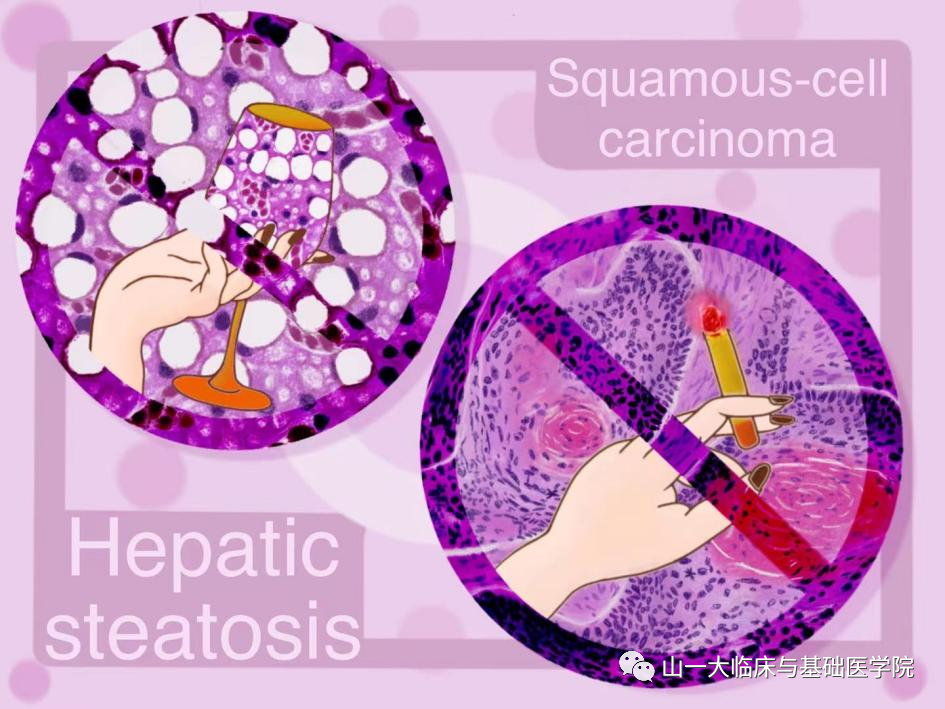 本作品为原创作品,以海报为背景,以“禁止图标”为核心加以拓展,将HE染色下肝细胞脂肪变性的空泡渲染成酒杯中的梦幻气泡,把鳞状细胞癌的角化珠刻画成烟头明灭的火焰,寓意着烟酒之乐不过是沤浮泡影,长久的健康将不复返。作品以令人迷思的紫色作为主色调,增加了一抹神秘,暗含烟酒令人迷惘之意,又将病理变化与警示标志相结合,从组织层面展示了烟酒造成的病霭,由此警醒人们:人生得意须尽欢,金樽烟斗梦中欢,三思后行拒千里,莫使亲人空对月!