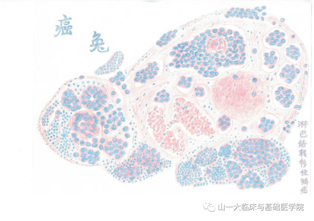 本作品为原创作品,描绘了淋巴结转移性鳞癌的镜下结构。以癌症为创作背景,将临床与病理诊断相融合,联系癌细胞经淋巴道转移的特点,突出了病理学诊断的准确性与权威性。形态可爱的小兔子,细探之下,竟是癌细胞扩散所导致的淋巴结肿大!病理学仿若有金睛火眼,可透过现象看本质,被临床医生称为诊断金标准“doctor's doctor”。