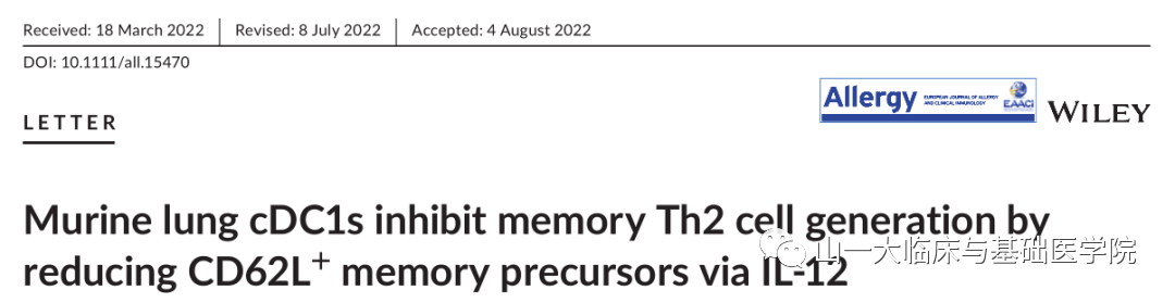 近日,三亿体育唐华教授研究团队在免疫学期刊Allergy(IF:14.71,中科院1区)上发表题为“Murine lung cDC1s inhibit memory Th2 cell generation by reducing CD62L+ memory precursors via IL-12”的研究论文。三亿体育刘建国博士为该论文第一作者,医学科技创新中心唐华教授为独立通讯作者。